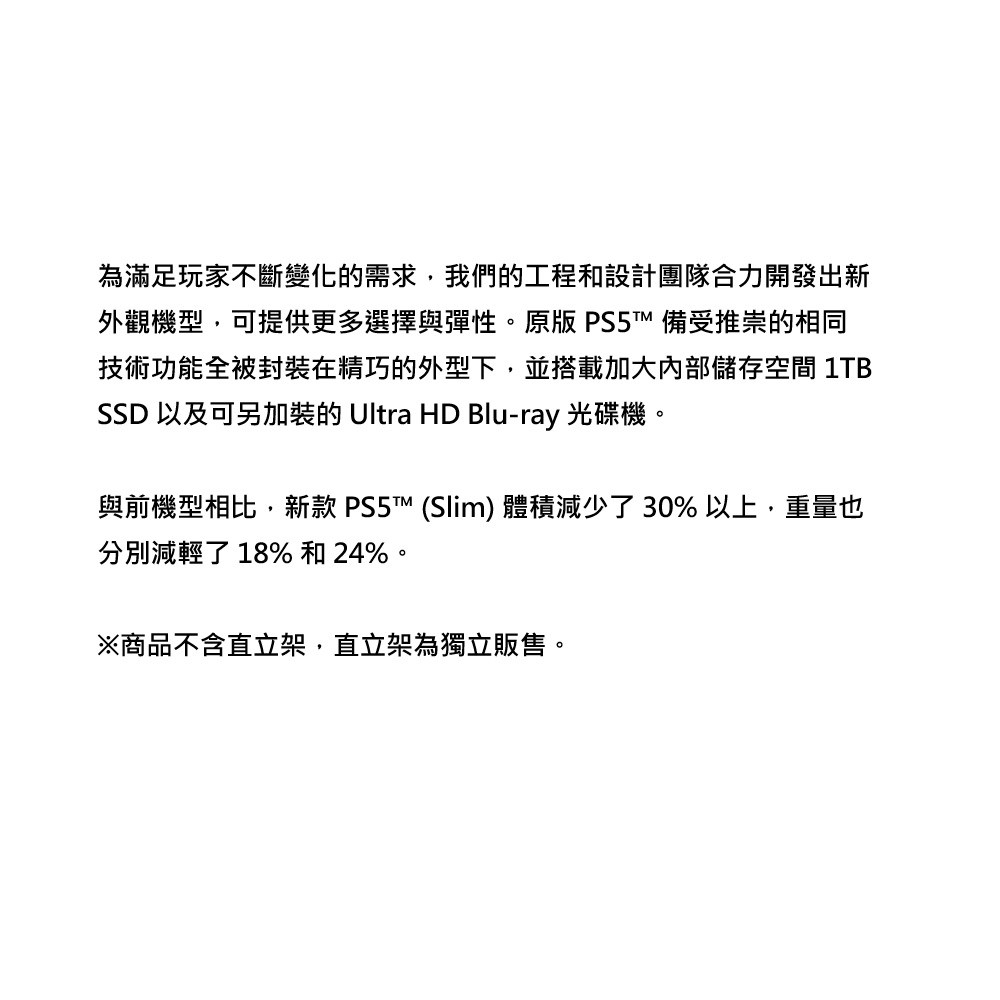 PS5 Slim光碟版CFI-2118A01,為滿足玩家不斷變化的需求而生。新款PS5體積減少了30%以上,重量也分別減輕了18%和24%。原版PS5備受推崇的相同技術功能全被封裝在精巧的外型下,並搭載加大內部儲存空間1TB SSD以及可另加裝的Ultra HD Blu-ray光碟機。讓您享受更輕巧、更強大的遊戲體驗。