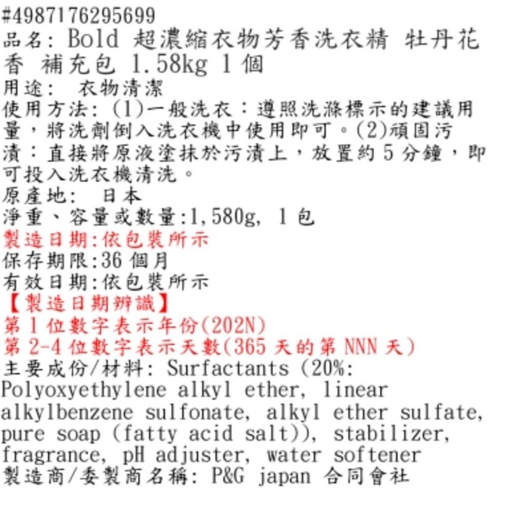 日本販售同款,P&G BOLD 超濃縮衣物芳香洗衣精,牡丹花香補充裝,讓您的衣物散發持久迷人香氣。超濃縮配方,用量更省,一次使用即可達到理想清潔效果。添加柔軟劑成分,洗後衣物觸感柔軟舒適,呵護全家人的肌膚。深入纖維,徹底去除污垢,讓衣物潔淨如新。補充裝設計,為地球盡一份心力。