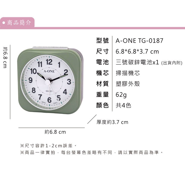 這款莫蘭迪色方形鬧鐘,以其簡約的設計和柔和的藍色調,為您的床頭或書桌增添一抹寧靜的色彩。尺寸小巧,僅68 x 68 x 37mm,重量輕盈,僅62g,方便攜帶和擺放。它不僅具有基本的鬧鐘功能,還配備了貪睡功能和夜光指針,讓您在黑暗中也能清晰讀時。此外,它使用3號電池供電,操作簡單,是您準時起床的好幫手。台灣製造,品質保證。