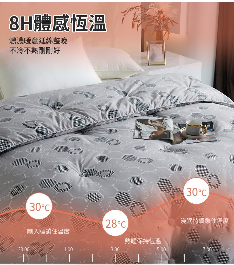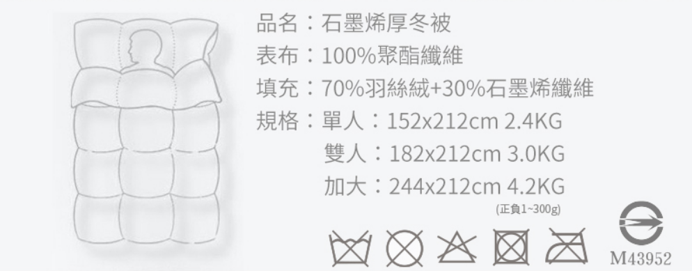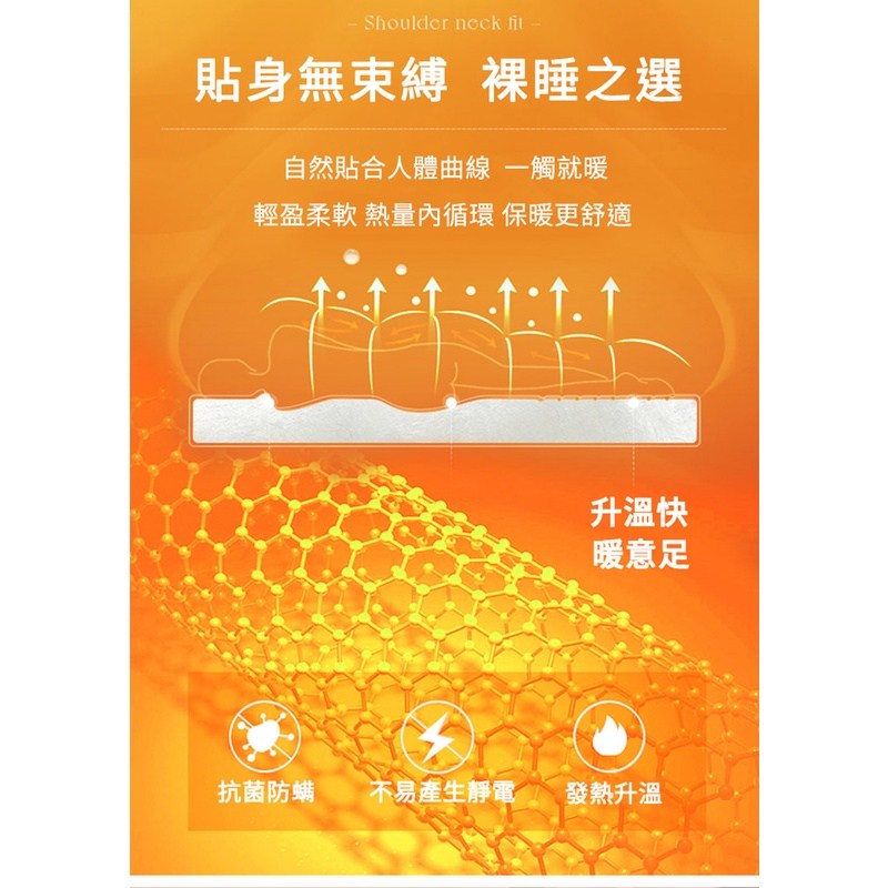 - 石墨烯纖維材質,輕柔覆蓋,提供舒適睡眠體驗,整夜溫暖不悶熱。