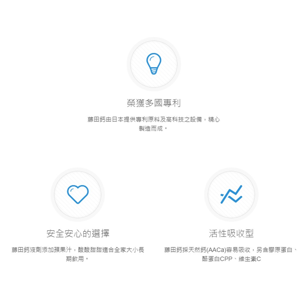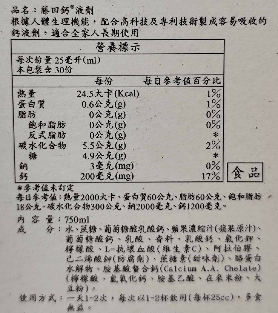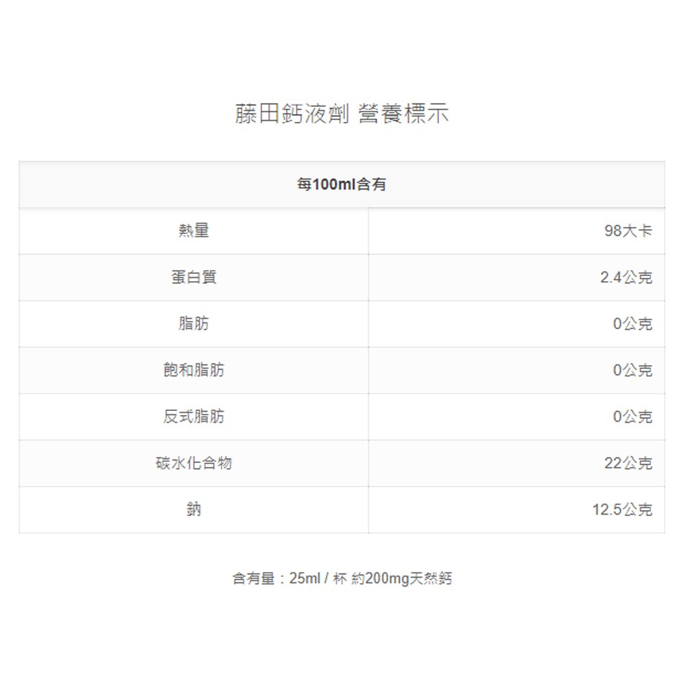 - 藤田鈣液劑口感清爽,容易入口,讓您輕鬆補充每日所需的鈣質營養。