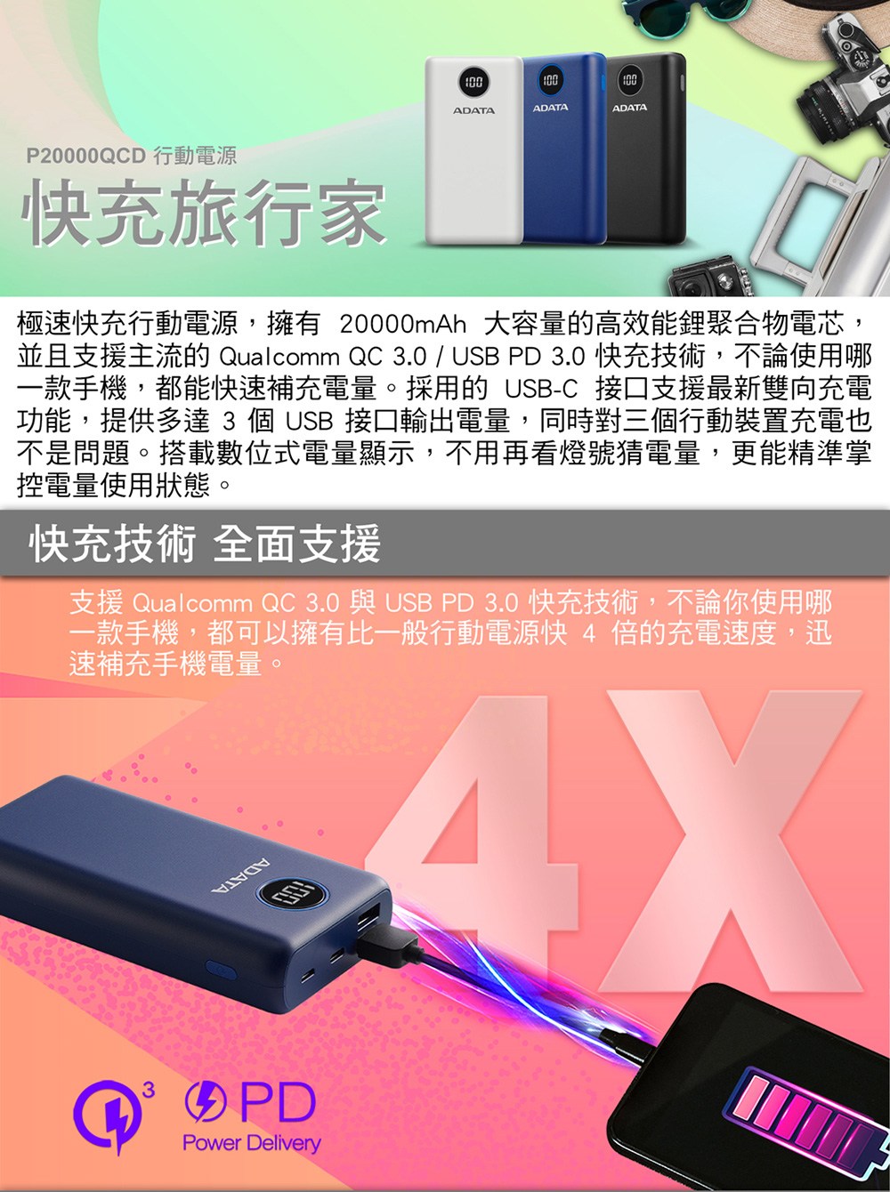 威剛P20000QCD快充行動電源,黑色外觀,簡約時尚,是您日常通勤的理想選擇。20000mAh大容量,告別電量焦慮,隨時隨地為您的智慧型手機等設備提供充足電力。支援PD3.0/QC3.0雙快充技術,充電速度比普通行動電源快4倍,節省您的寶貴時間。配備4個充電埠,可同時為多個設備充電,與家人朋友共享便捷。數位顯示電量,精確掌握剩餘電量,出行更安心。厚度僅27mm,輕巧便攜,輕鬆放入包包,隨時隨地滿足您的充電需求。