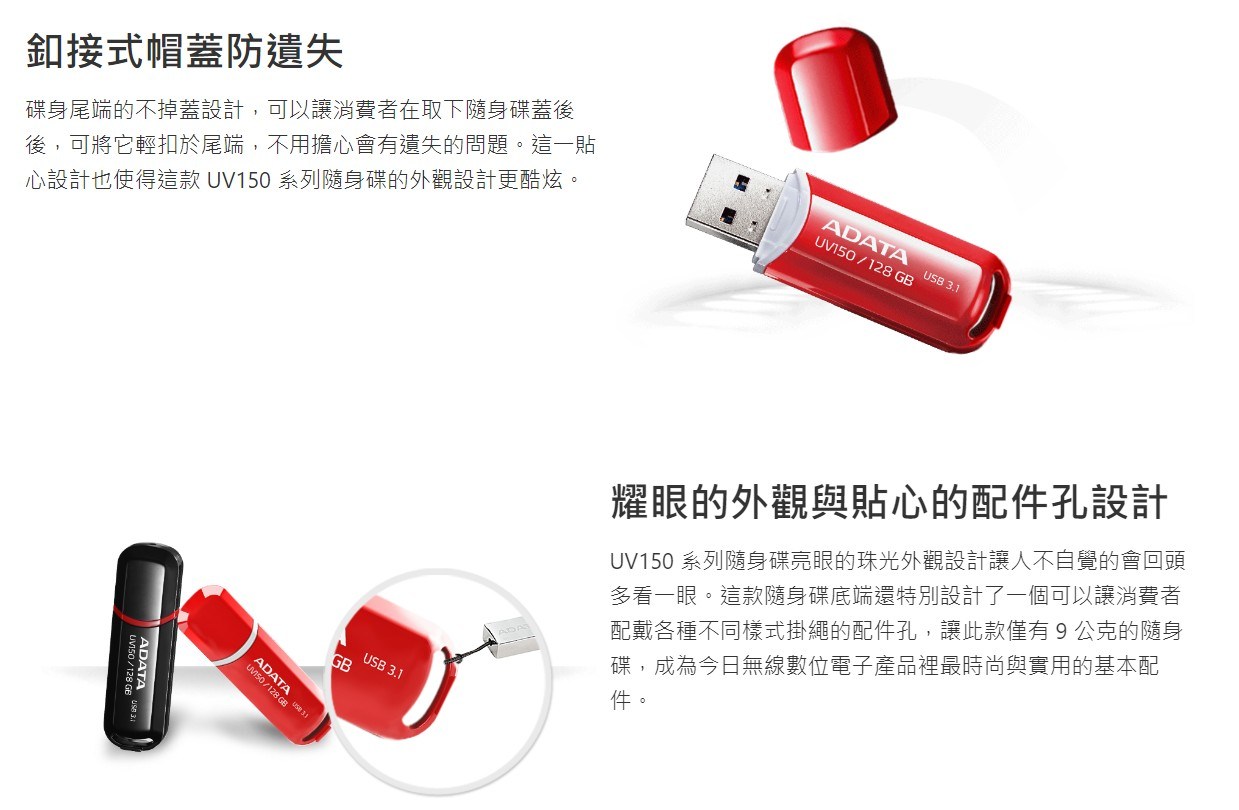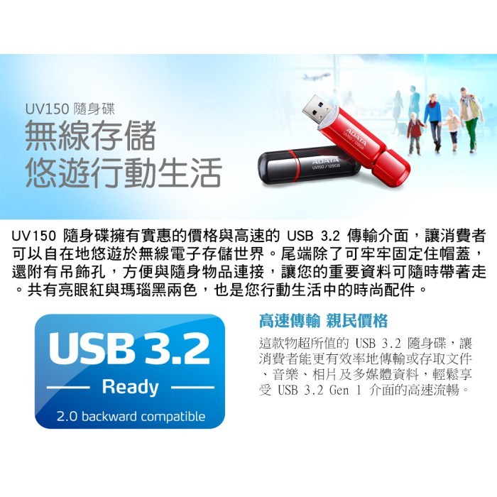 威剛 UV150 32GB USB 3.2 隨身碟,紅色外觀時尚亮眼,是您儲存資料的理想選擇。採用高速 USB 3.2 Gen 1 介面,傳輸速度更快,節省您的寶貴時間。32GB 的儲存容量,足以應付日常文件、照片、音樂等檔案的需求。伸縮式接頭設計,保護 USB 接頭免受損壞,隨身碟尾端設有吊飾孔,方便攜帶不易遺失。無論是工作、學習或娛樂,威剛 UV150 隨身碟都能滿足您的儲存需求。
