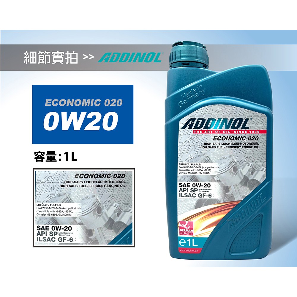 ADDINOL Economic 0W-20全合成機油是一款高性能引擎潤滑油,專為現代汽車引擎設計。採用德國原裝進口配方,確保在各種駕駛條件下提供卓越的引擎保護。其0W-20的黏度等級,有助於降低引擎摩擦,提高燃油效率,節省能源。符合Ford、Chrysler、GM等多項國際標準認證,適用於多種車型。選擇ADDINOL,為您的愛車提供最佳的潤滑保護,延長引擎壽命。
