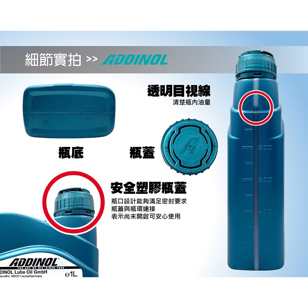 - ADDINOL 0W-20全合成機油,提供卓越的引擎保護,延長引擎使用壽命。