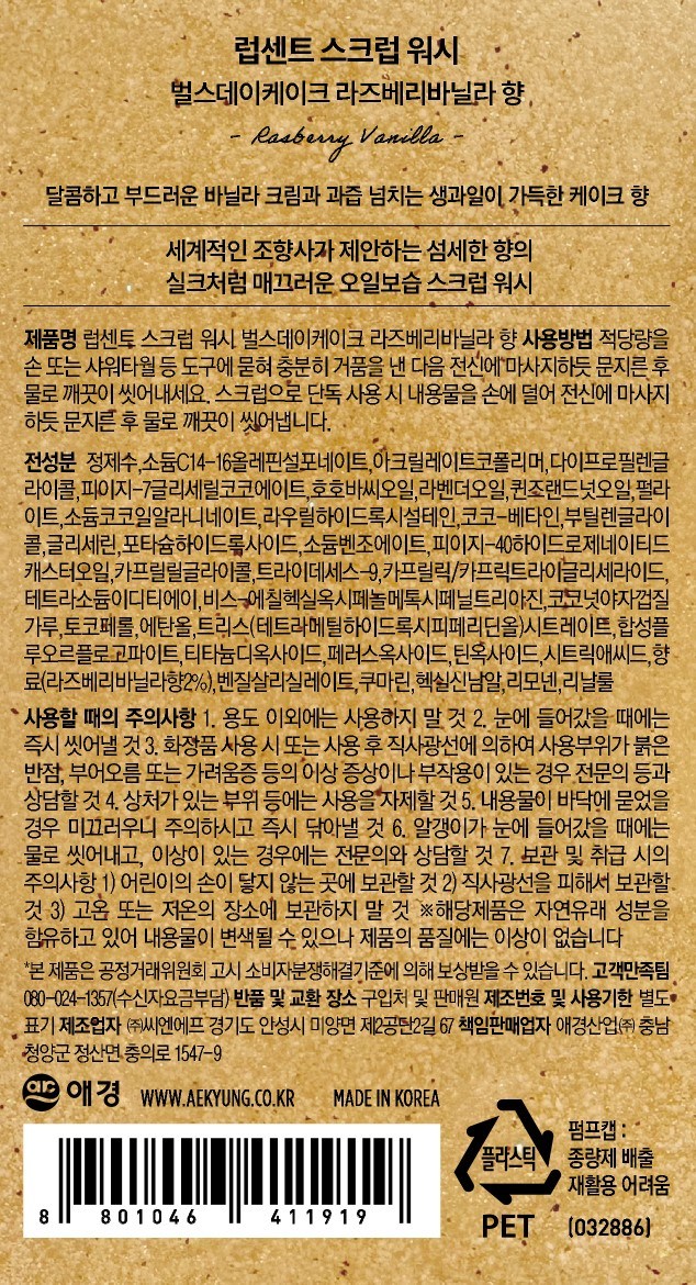 AEKYUNG Luvscent香氛去角質磨砂沐浴露,讓您在沐浴時享受生日蛋糕般的甜蜜香氛。這款獨特的磨砂沐浴露,結合了覆盆子和香草的誘人氣息,為您帶來愉悅的沐浴體驗。產品中添加了荷荷巴籽油、薰衣草油與澳洲堅果油等多種保濕成分,能有效滋潤肌膚,洗後不乾澀。細緻的磨砂顆粒能溫和去除老廢角質,使肌膚更加光滑細緻。讓Luvscent香氛去角質磨砂沐浴露,為您的肌膚帶來柔滑觸感與迷人香氣。