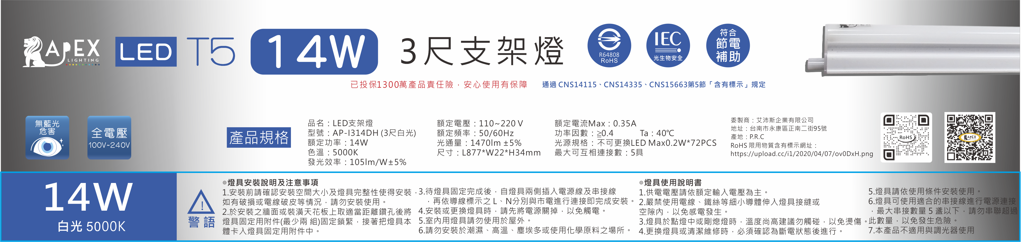 APEX艾沛斯高功T5支架燈,為您的空間帶來明亮且節能的照明解決方案。這款3尺14W的支架燈,提供5000K白光,營造清晰舒適的照明環境,適用於居家、辦公室等多種場所。採用高品質LED光源,不僅節省能源,更具有長壽命的優點,減少更換頻率。產品通過多項安全認證,讓您使用更安心。簡約設計,安裝方便,是您提升照明品質的理想選擇。