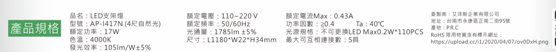 APEX 艾沛斯 彩盒T5四尺17W全塑支架燈,為您的空間帶來明亮自然的照明。這款LED燈具採用全塑材質,輕巧耐用,適用於各種室內環境。17W的功率提供節能高效的照明,4000K的自然光色溫,營造舒適的工作或生活氛圍。尺寸為1180 x 22 x 34mm,安裝簡便,即插即用。選擇APEX 艾沛斯,享受高品質且安心的照明體驗。