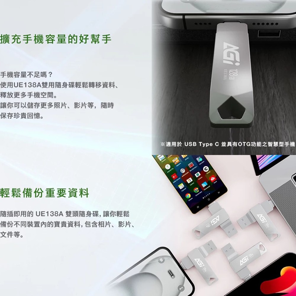 AGI TYPE C 雙用隨身碟,UE138A,讓您輕鬆儲存和傳輸資料。這款32GB USB 3.2隨身碟採用TYPE C接口,方便連接各種設備,無論是手機、平板還是電腦,都能快速傳輸檔案。其輕巧便攜的設計,讓您可以隨身攜帶,隨時隨地備份重要資料。AGI隨身碟經過嚴格測試,確保資料安全可靠,讓您安心使用。此外,其耐用材質和精湛工藝,確保產品長久使用,是您資料儲存的最佳選擇。