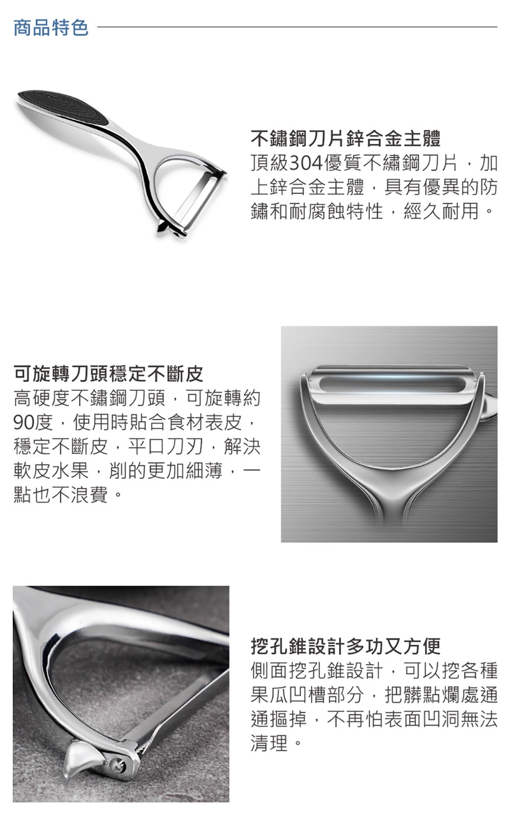AHOYE精鑄不鏽鋼蔬果削皮器採用優質不鏽鋼材質,堅固耐用且不易生鏽,確保食品安全。銀色外觀設計簡約時尚,為您的廚房增添一抹亮色。符合人體工學的握把設計,提供舒適的握感,即使長時間使用也不易感到疲勞。刀頭可旋轉,能貼合蔬果表面,削皮更順暢,減少食材浪費。適用於多種蔬果,是您廚房中不可或缺的好幫手。