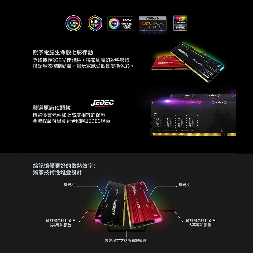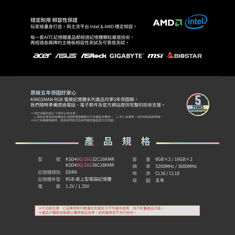 AITC 艾格 KINGSMAN RGB DDR4 8GB 3200 UDIMM 桌上型電競超頻記憶體,為您的電腦提供卓越的效能和令人驚豔的視覺效果。這款紅色記憶體採用DDR4技術,速度高達3200MHz,能有效提升遊戲和多媒體應用程式的運行速度,還具備獨特的RGB燈效,可通過主機板軟體進行自定義,打造個性化的電競風格。8GB的容量足以應付日常使用和主流遊戲需求,UDIMM外形規格使其適用於大多數桌上型電腦,確保與Intel和AMD平台相容,並提供五年原廠保固,讓您安心使用。