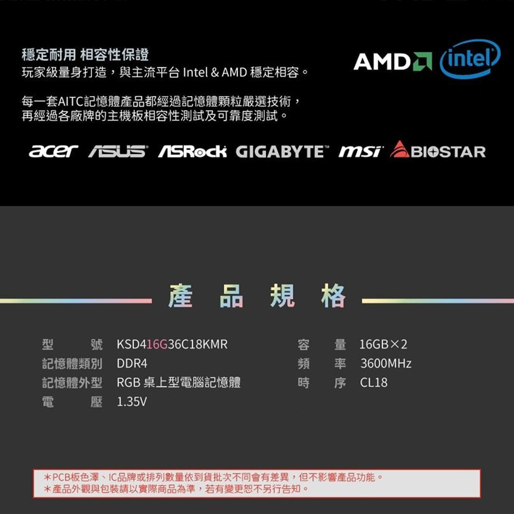 AITC 艾格 KINGSMAN RGB DDR4 32GB(16GBx2) 桌上型電競超頻記憶體 3600MHz CL18, 3200 UDIMM, 1組
