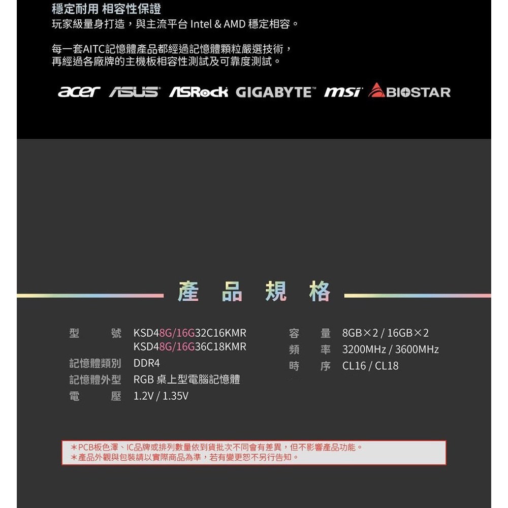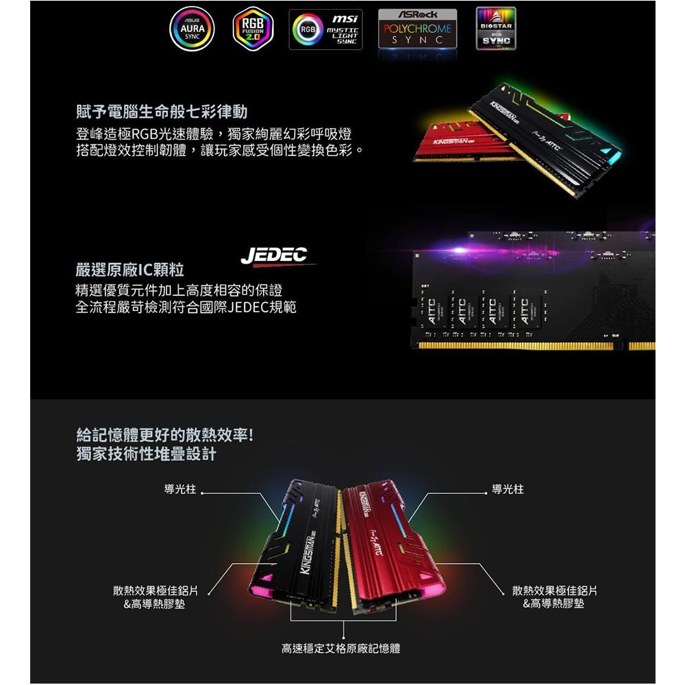 AITC 艾格 KINGSMAN 桌上型電競超頻記憶體 RGB DDR4 Set 2個, 採用原廠高品質IC顆粒,確保穩定性能, 1組