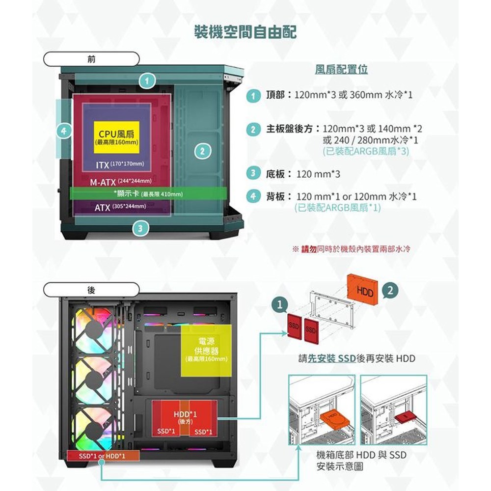 - 內建四個ARGB風扇,提供絢麗奪目的燈光效果,讓您的電腦機殼更具個性化。