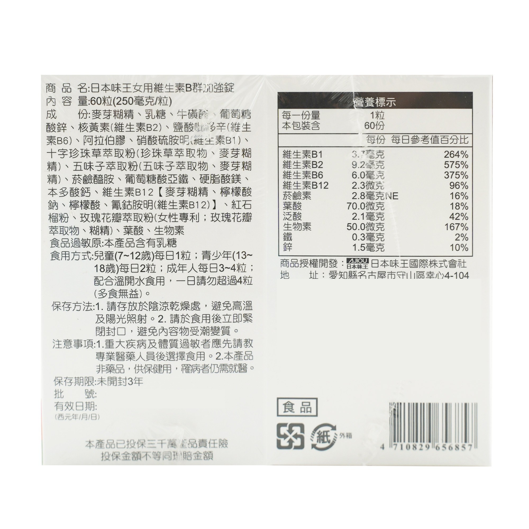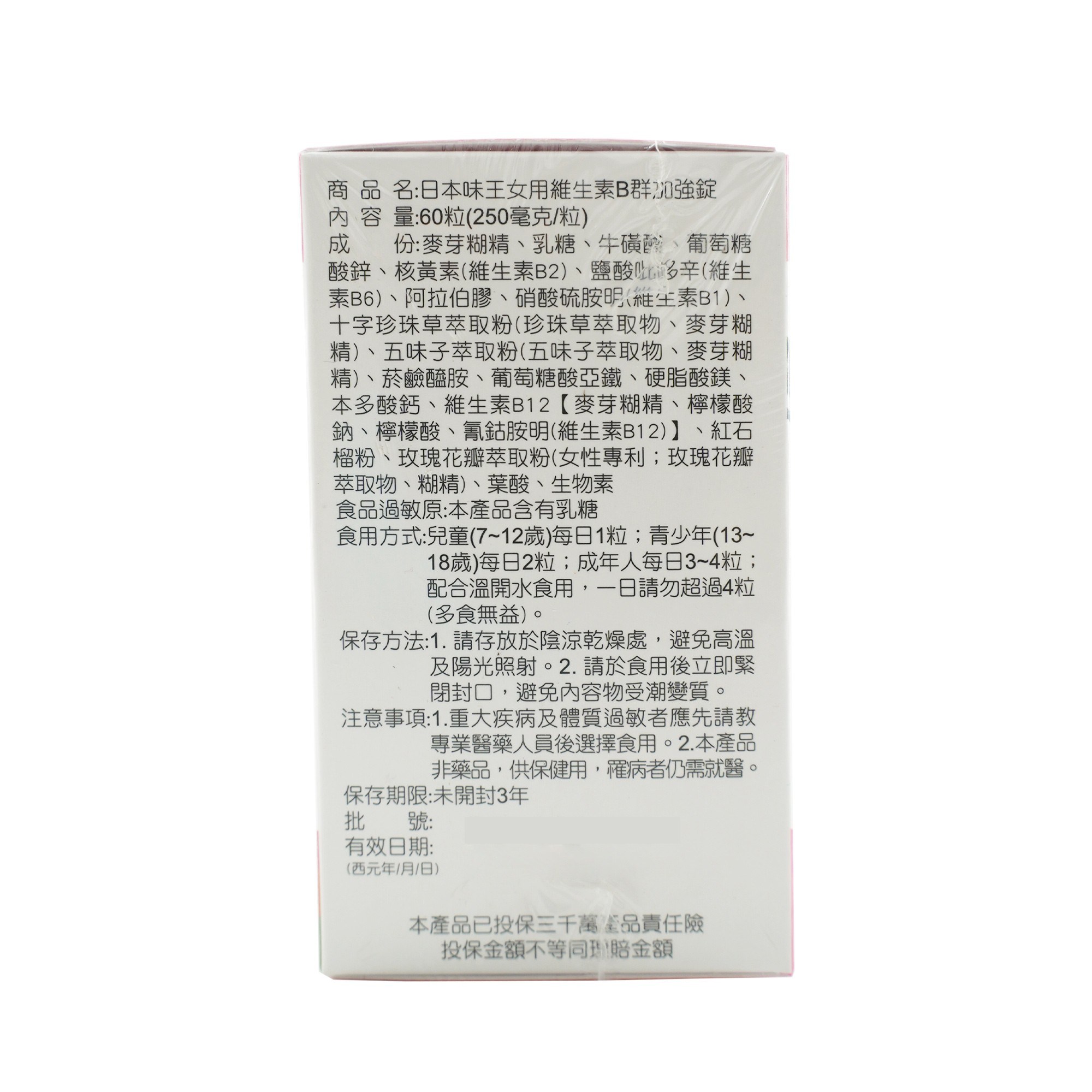 日本味王女用維生素B群+鐵,專為女性設計的營養補充品,每罐60顆。這款產品結合了完整的B群維生素,有助於維持能量正常代謝,並添加了鐵質,有助於紅血球的形成,讓您擁有紅潤好氣色。特別添加玫瑰花瓣萃取,讓您由內而外散發美麗光彩。適合兒童、青少年及成人食用,每日補充,讓您輕鬆擁有健康活力。本產品已投保產品責任險,讓您安心食用。