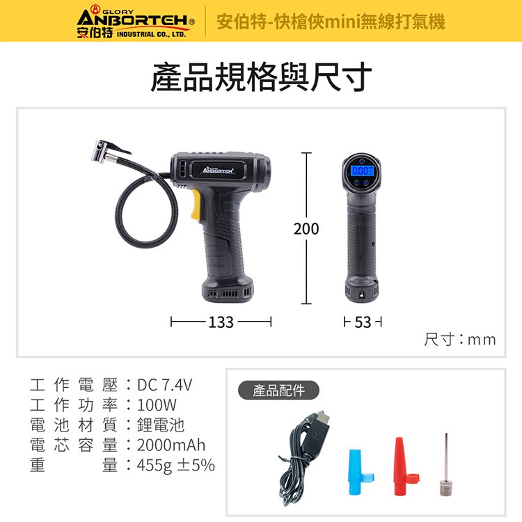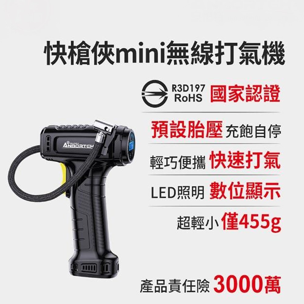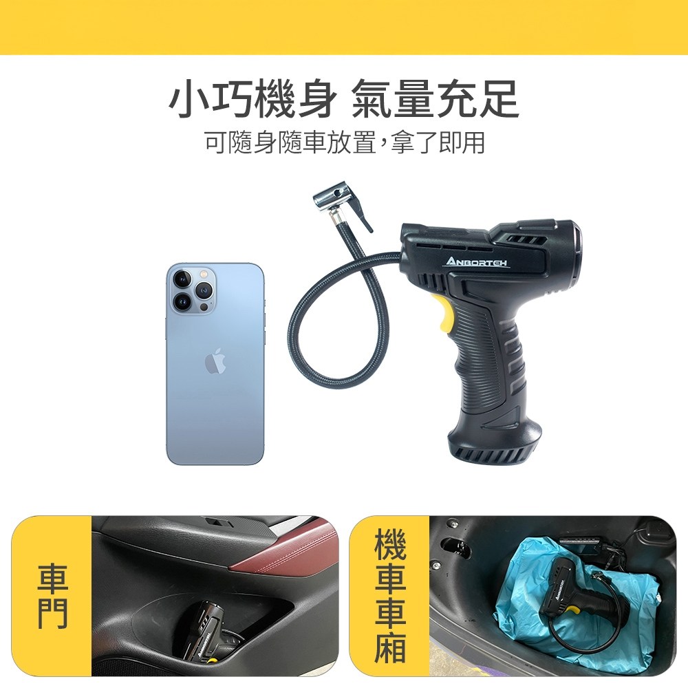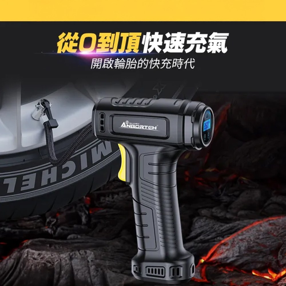 ANBORTEH 安伯特 快槍俠mini無線打氣機,輕巧便攜,隨時隨地解決輪胎或球類等充氣需求。採用無線設計,擺脫電線束縛,使用更方便。預設胎壓功能,充飽自停,避免過度充氣。LED照明,夜間也能輕鬆操作。體積小巧,重量僅455g,方便收納於車內或家中,隨時應急。