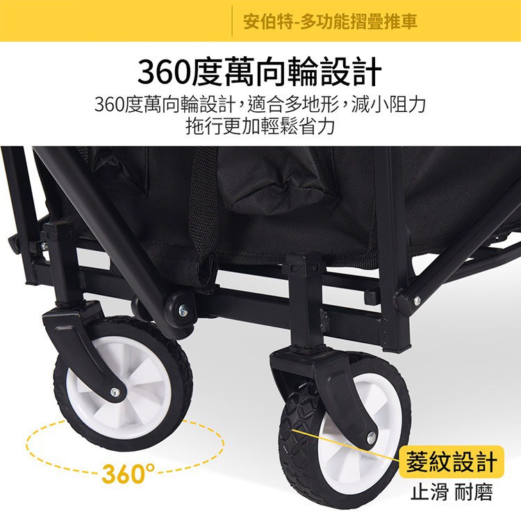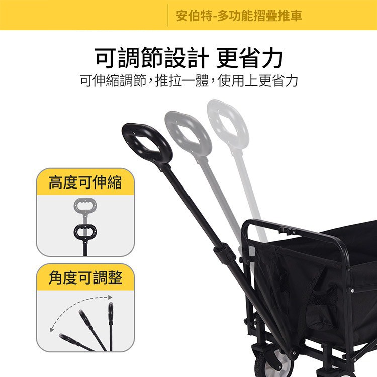 ANBORTEH 安伯特 戶外露營多功能折疊手推車是您戶外探險的理想幫手。這款手推車採用堅固的鋼架和耐用的600D牛津布,確保承重穩固,不易撕裂,讓您安心運送露營裝備或其他物品。其可調節高度和角度的拉桿設計,讓您輕鬆省力地拖行,而360度萬向輪則能應對各種地形,減少阻力。此外,手推車還具備三秒快速折疊功能,收納尺寸小巧,方便攜帶和存放。無論是露營、野餐還是購物,這款多功能手推車都能滿足您的需求,讓您的戶外生活更加輕鬆愉快。