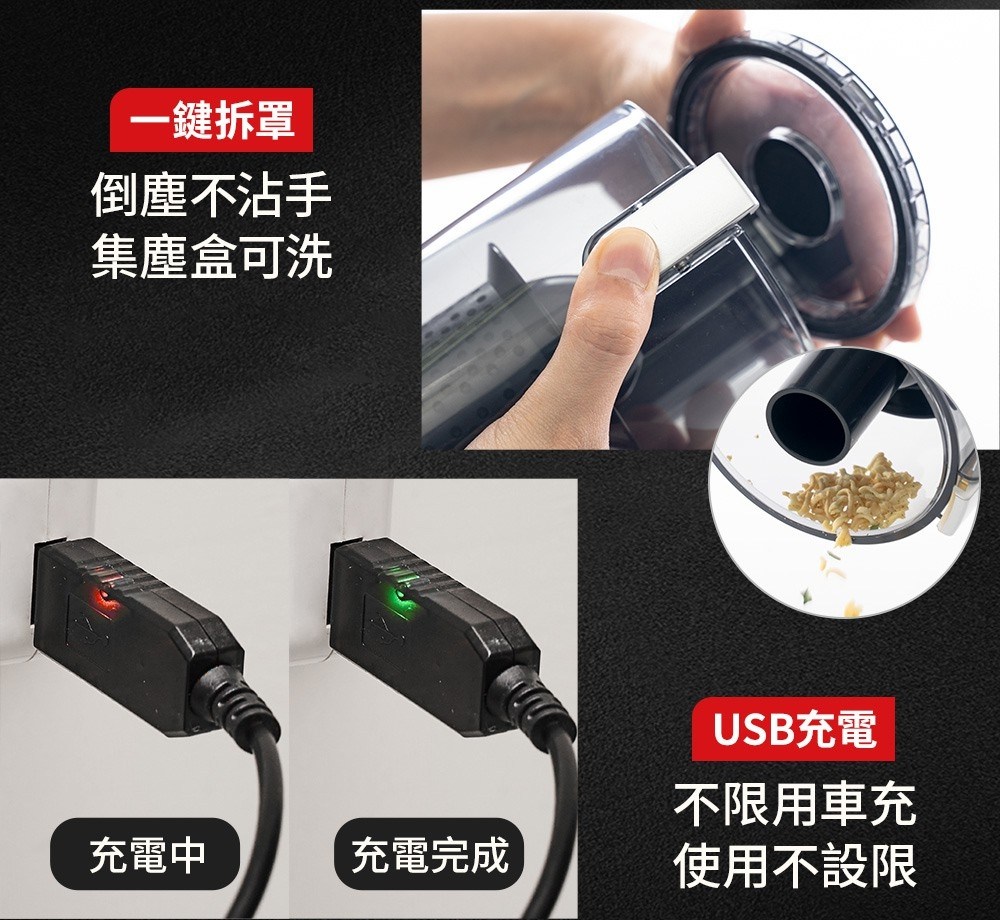 - USB充電設計,隨時隨地充電,讓您的清潔工作不間斷,保持車內環境的整潔。