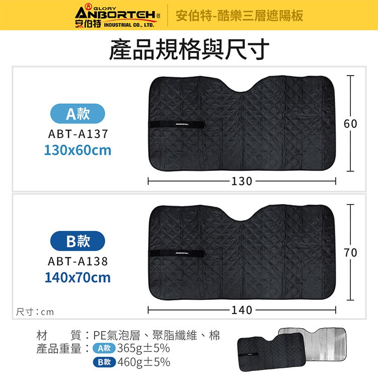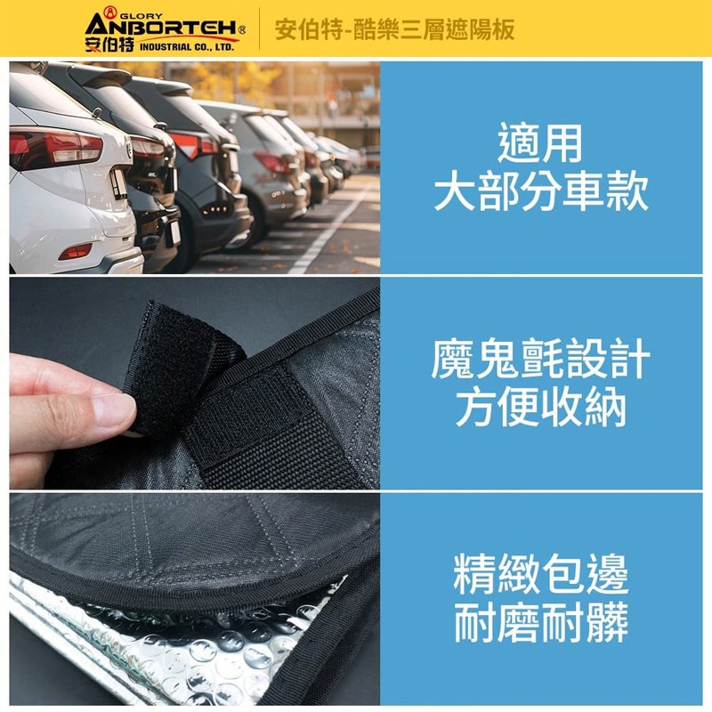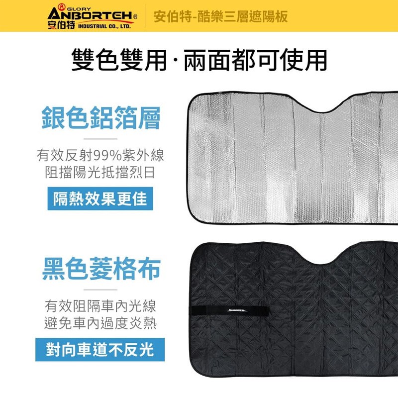 ANBORTEH 酷樂三層加厚汽車遮陽板,有效阻擋陽光,降低車內溫度,讓您在炎炎夏日也能擁有舒適的駕駛體驗。這款遮陽板採用三層加厚設計,具有卓越的隔熱效果,能有效反射紫外線,保護您的愛車內飾免受老化。尺寸為140 x 70cm,B款設計,適用於多數車型,安裝簡便,使用車內遮陽板固定即可。雙面可用,銀色鋁箔層有效反射陽光,黑色菱格布阻隔車內光線,避免車內過度炎熱。精緻包邊,耐磨耐髒,魔鬼氈設計方便收納,是您夏季行車的理想選擇。