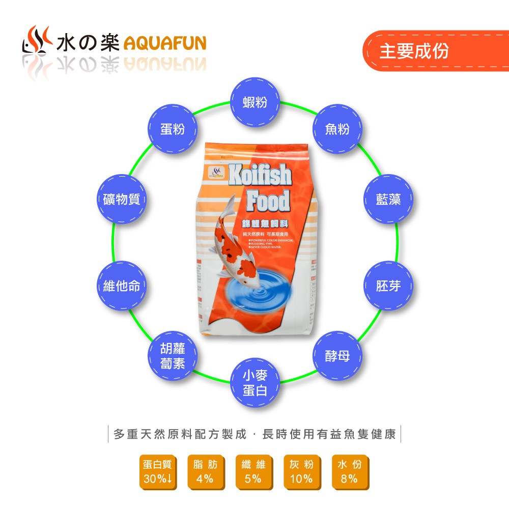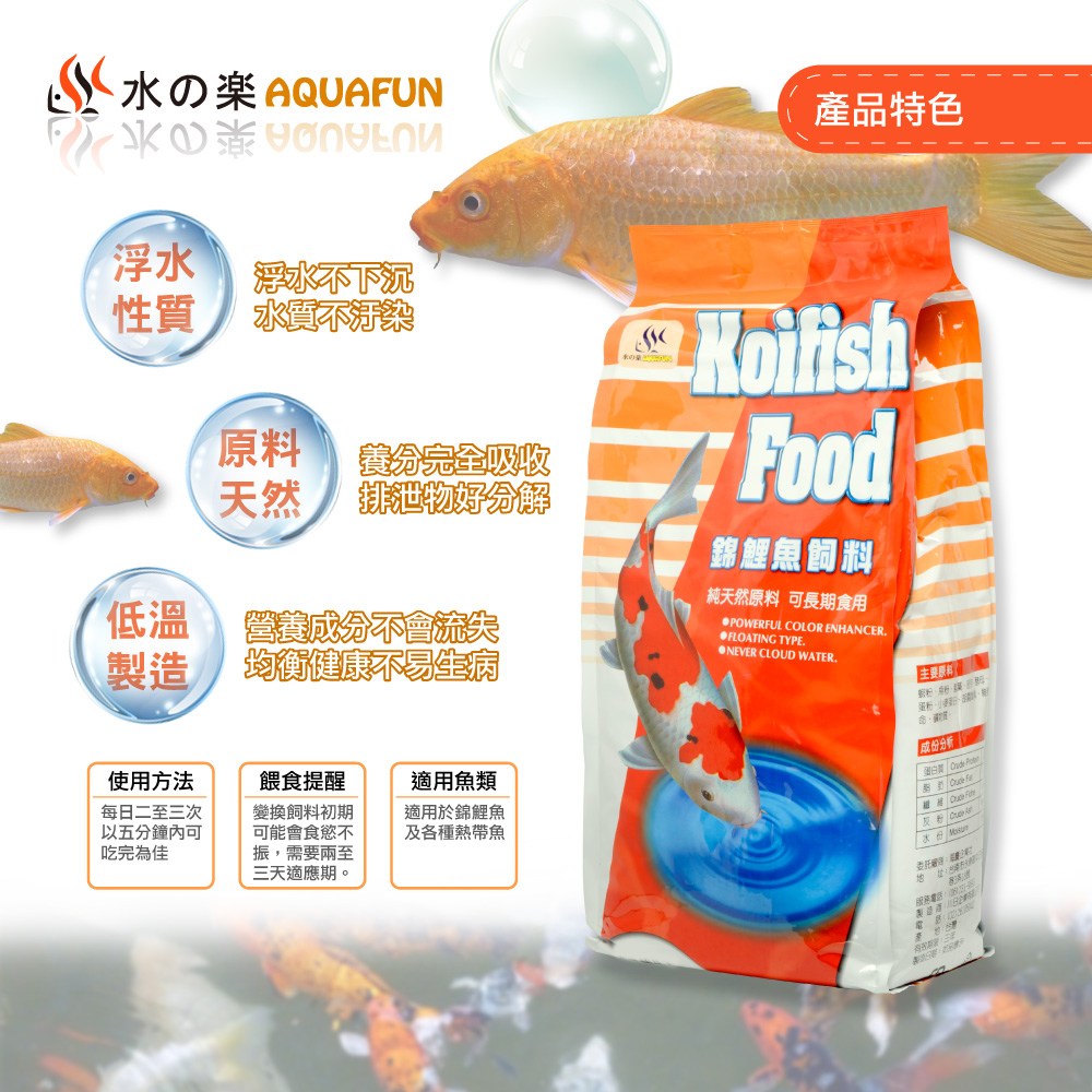 - 獨特漂浮配方設計,讓飼料浮在水面,方便錦鯉進食,減少殘餌沉積,保持水質清潔。