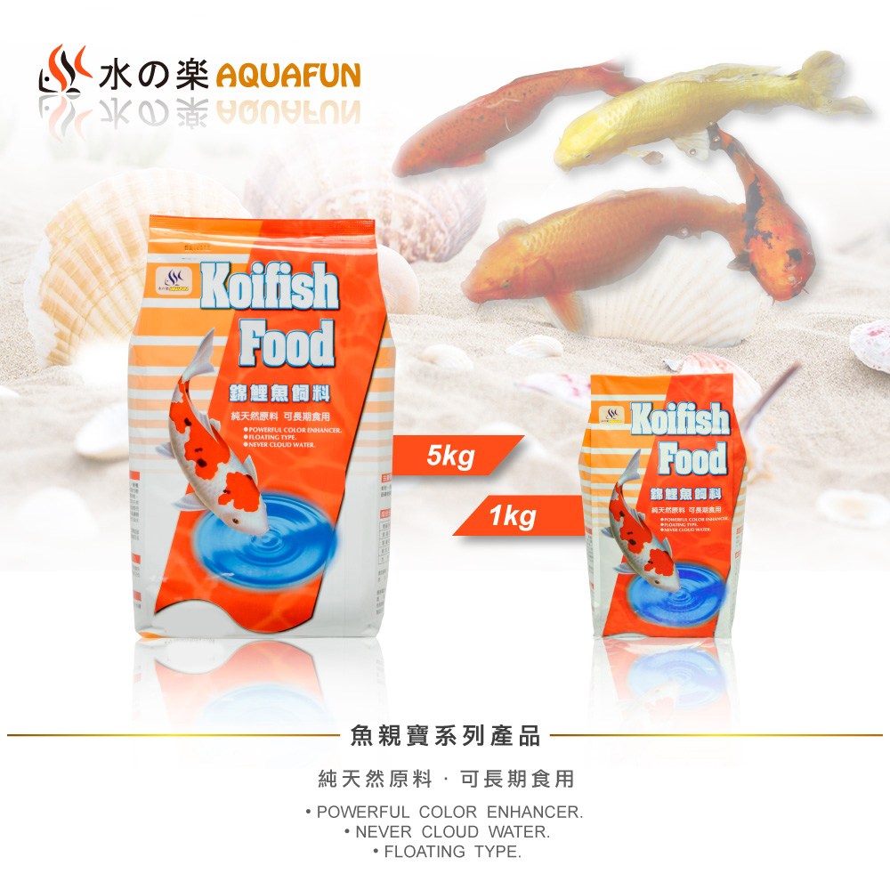 AQUAFUN 水之樂錦鯉魚飼料,為您的錦鯉提供全面均衡的營養,長期使用有益魚隻健康。獨特的漂浮顆粒設計,讓您的愛魚更容易進食,同時避免飼料沉入水底污染水質,能有效增強魚隻的體色,讓您的錦鯉更加鮮豔奪目。此外,本產品絕不污染水質,讓您的魚缸保持清澈透明。每日餵食二至三次,投餵量以五分鐘內可吃完為佳,確保您的錦鯉獲得充足的營養,健康成長。
