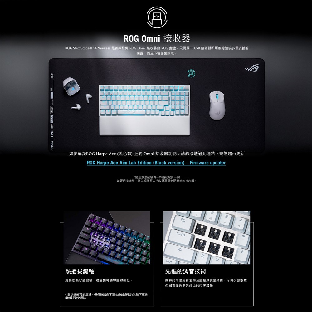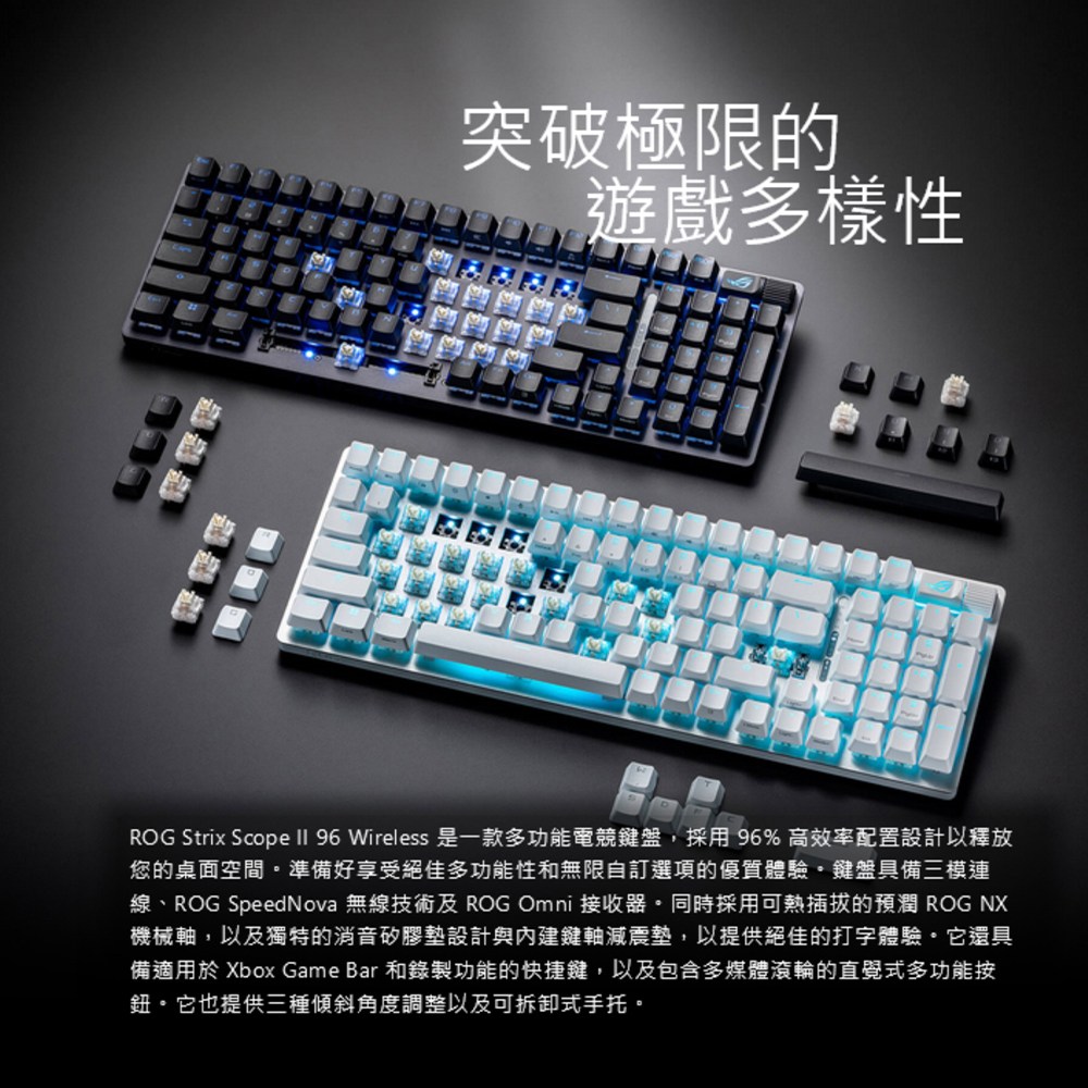 華碩 ROG Strix Scope II 96 Wireless 無線電競鍵盤,以其96%的精巧配置,為您的桌面釋放更多空間。這款白色鍵盤不僅外觀時尚,更搭載了ROG風暴軸,提供卓越的觸感和響應速度,讓您在遊戲中佔盡優勢。具備三模連線功能,包括無線2.4GHz和藍牙,確保您隨時隨地都能暢玩。此外,其優異的消音結構和可拆卸腕托設計,更提供極致的舒適體驗,讓您長時間遊戲也不感疲勞。ROG Strix Scope II 96 Wireless,是您提升遊戲體驗的最佳選擇。