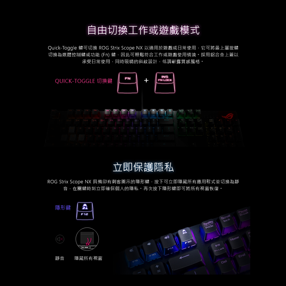 ASUS 華碩 ROG Strix Scope NX RGB 機械式電競鍵盤,為您帶來極致的遊戲體驗。採用紅軸設計,提供快速靈敏的反應,讓您在遊戲中佔盡優勢。ROG Strix Scope NX RGB 鍵盤不僅擁有出色的性能,更具備炫麗的 RGB 燈光效果,可透過 Aura Sync 技術與其他 ROG 設備同步,打造獨一無二的遊戲氛圍。此外,鍵盤還配備 Quick-Toggle 鍵,方便您在工作和遊戲模式之間快速切換,並具備隱形鍵功能,保護您的個人隱私。ROG Strix Scope NX RGB 鍵盤是您征戰遊戲世界的最佳夥伴。