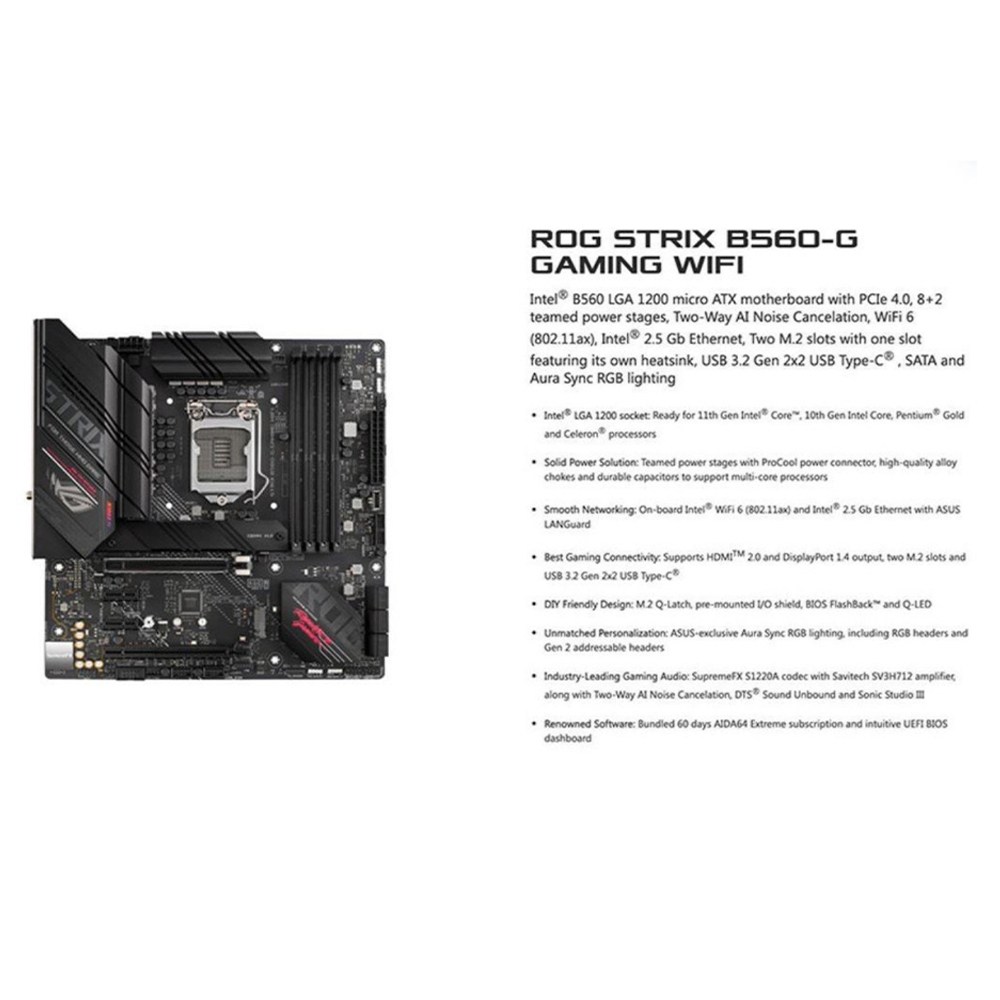 ASUS 華碩 ROG STRIX B560-G GAMING WIFI 主機板,尺寸為 24.4 x 24.4 公分,是組裝高效能遊戲電腦的理想選擇。這款主機板支援 Intel LGA 1200 插槽,相容第 11 代和第 10 代 Intel Core 處理器,提供卓越的效能和擴充性。內建 Wi-Fi 6 無線網路,確保流暢的線上遊戲體驗和快速的檔案傳輸速度。ROG STRIX 系列以其卓越的品質和可靠性而聞名,B560-G GAMING WIFI 主機板也不例外,採用高品質元件和先進的散熱設計,確保系統穩定運行。此外,它還支援 Aura Sync RGB 燈效,讓您可以自定義燈光效果,打造獨一無二的遊戲風格。