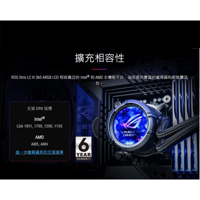 ROG STRIX LC III 360 ARGB LCD 飛龍三代 LCD版水冷散熱器,為您的電腦提供卓越的散熱效能和獨特的美學風格。這款散熱器採用先進的液體冷卻技術,有效降低CPU溫度,確保系統在高負載下穩定運行。內建的360mm散熱排和三個ARGB風扇,提供強大的散熱能力,同時呈現絢麗的燈光效果,可通過Aura Sync與其他ROG設備同步,打造個性化的燈光系統。此外,LCD顯示屏可自定義顯示圖片、動畫或系統資訊,讓您隨時掌握電腦狀態,展現獨一無二的風格。支援Intel和AMD多種CPU插槽,安裝簡便,並提供六年保固,讓您安心使用。