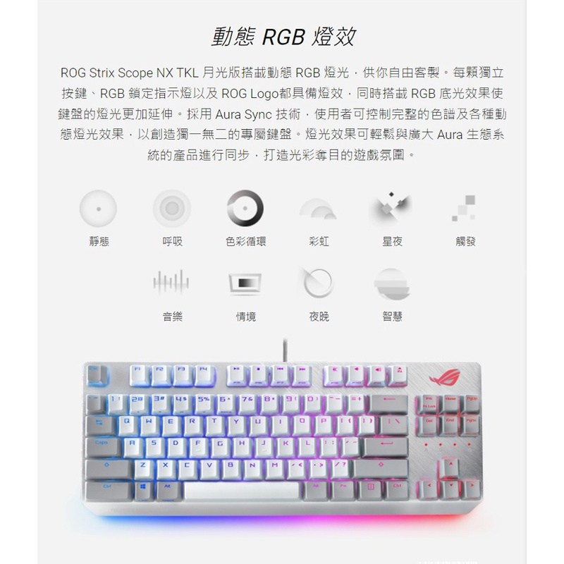 ASUS 華碩 ROG STRIX SCOPE NX TKL 月光白 紅軸電競鍵盤,以其簡潔的80% TKL設計,為追求桌面空間的玩家提供更靈活的操作體驗。月光白配色賦予鍵盤優雅外觀,搭配ROG NX紅軸,提供線性、靈敏的按鍵反饋,適合追求快速反應的遊戲玩家。此款鍵盤採用耐用的鋁合金上蓋,並支援Aura Sync RGB燈效,讓玩家可自定義鍵盤燈光,打造獨一無二的遊戲氛圍。無論是FPS遊戲還是其他類型的遊戲,ROG STRIX SCOPE NX TKL都能提供卓越的性能和舒適的使用體驗。