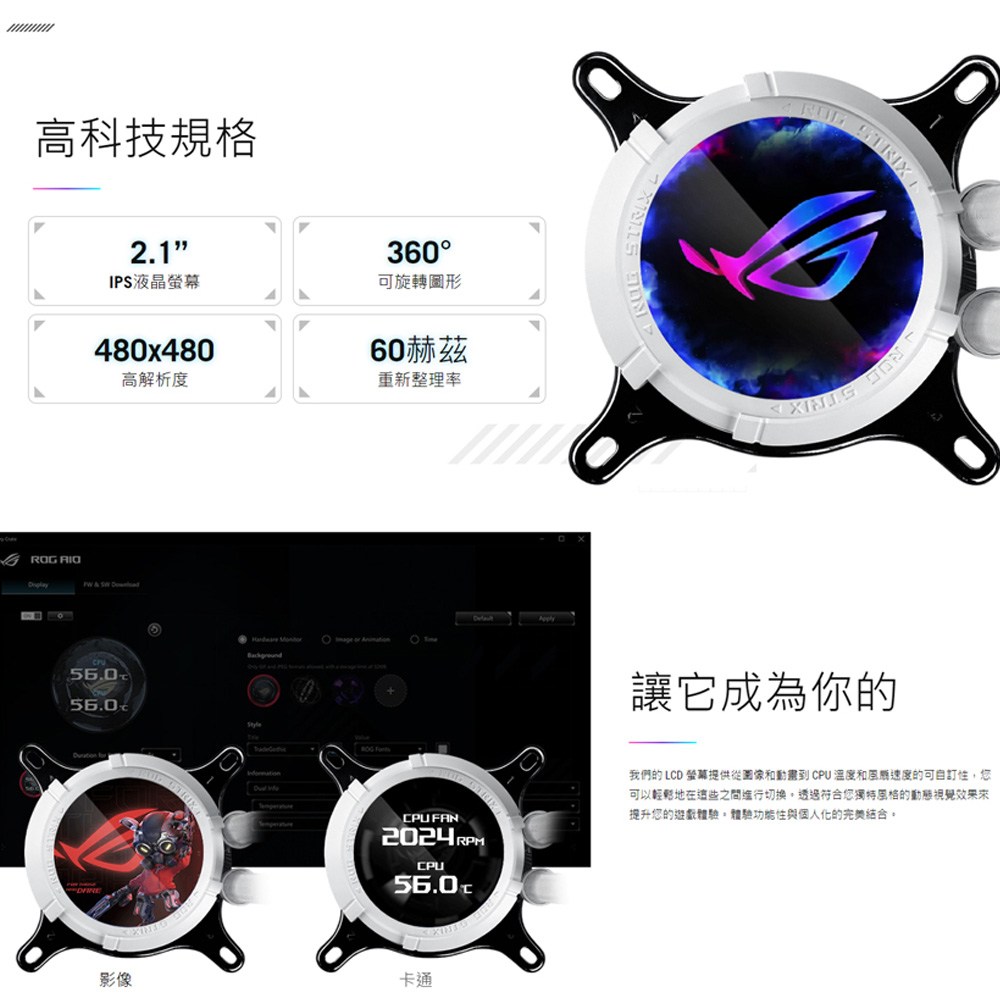 - ROG STRIX LC III 360 ARGB水冷散熱器,具備2.1吋IPS高解析度液晶螢幕,可自訂顯示CPU溫度與風扇轉速。