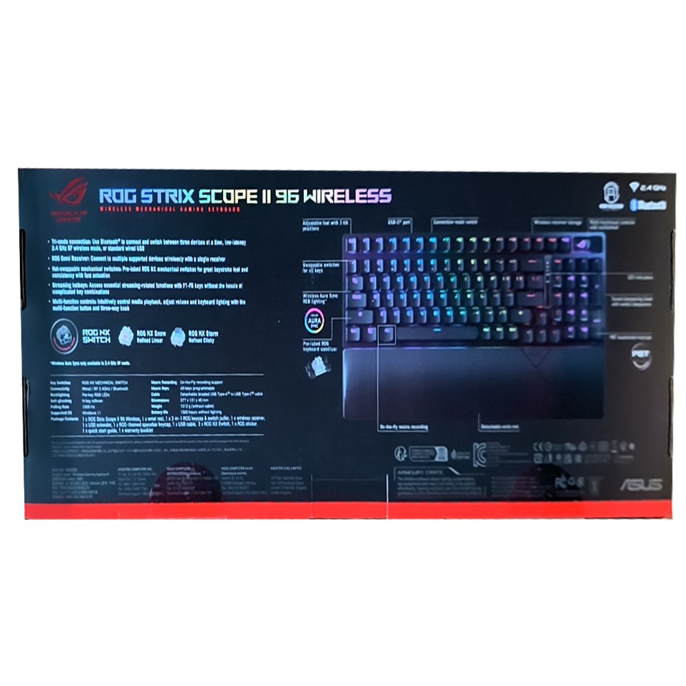 ASUS 華碩 ROG Strix Scope II 96 Wireless 無線鍵盤是一款專為遊戲玩家設計的高效能鍵盤。它採用三模連線,包括藍牙、2.4 GHz RF無線和有線USB,讓您隨時隨地輕鬆切換。熱插拔機械軸設計,搭配預潤ROG NX雪軸,提供絕佳的按鍵手感和一致性。此外,它還具有多功能控制,可直覺地控制媒體播放、調整音量和鍵盤燈光。具備可拆卸式手托和三種可調整角度,提供長時間的舒適性。