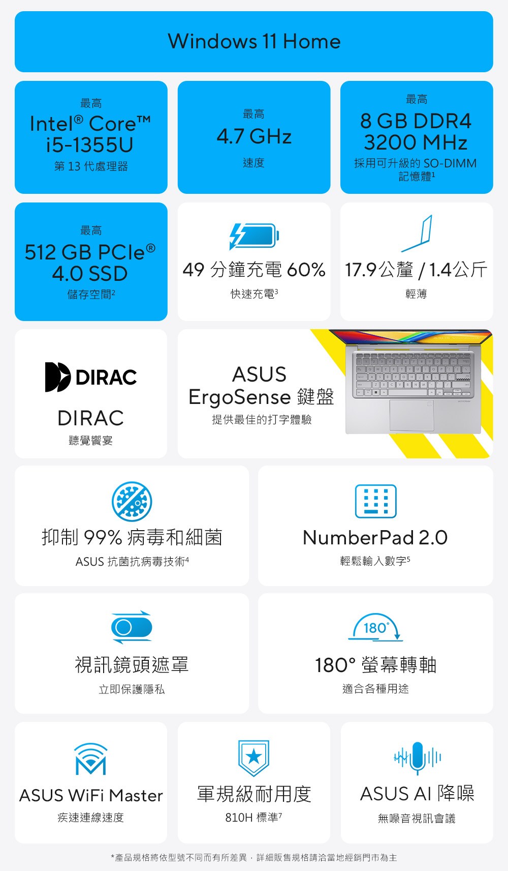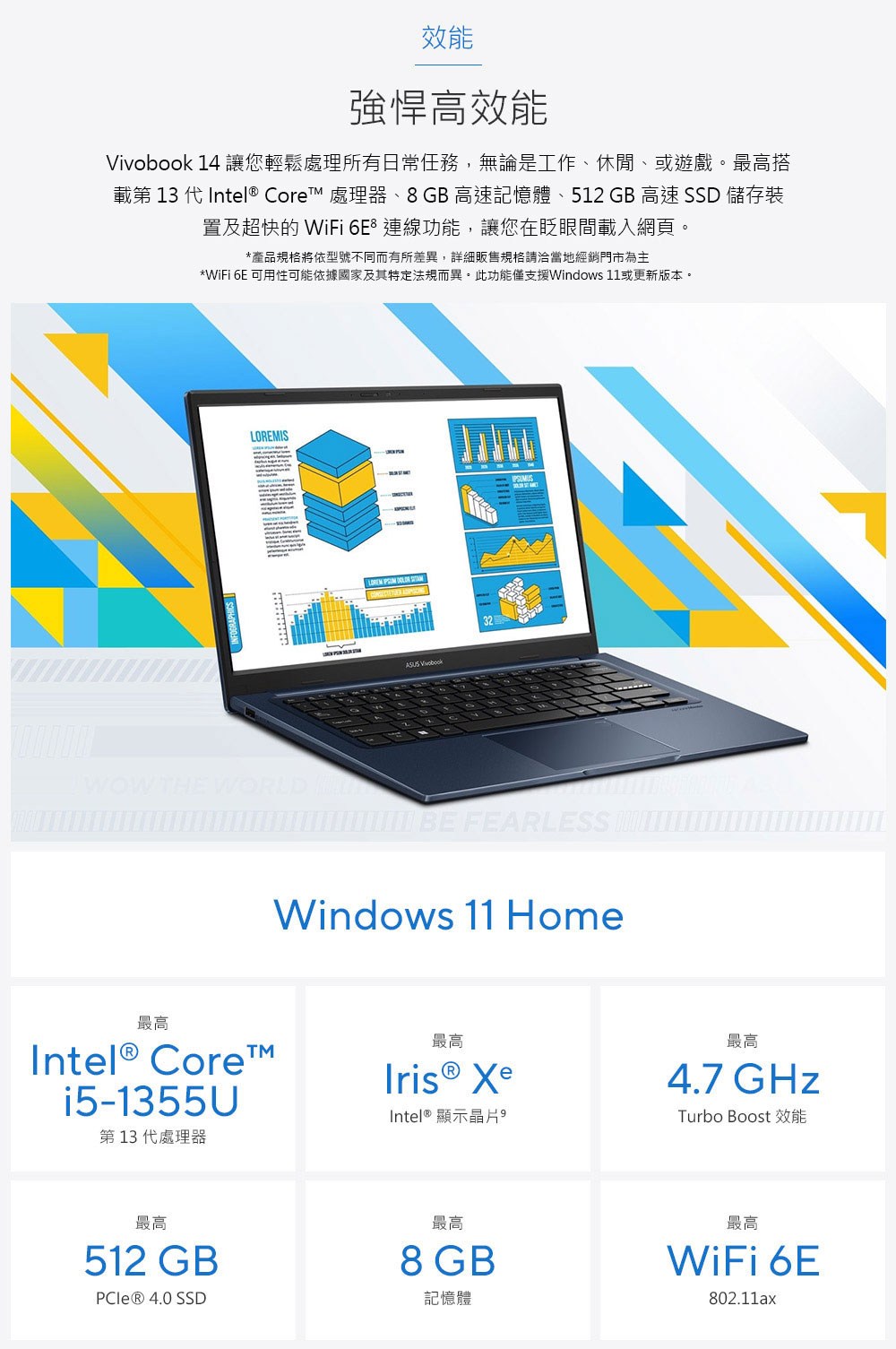 ASUS 華碩 VivoBook 14 筆電是一款輕薄高效的筆記型電腦,搭載最新第13代Intel Core i5處理器和8GB記憶體,能輕鬆處理各種日常任務。其14吋窄邊框螢幕提供清晰的視覺體驗,並通過德國萊因低藍光護眼認證,有效減少疲勞。此外,內建的抗菌抗病毒技術,能抑制細菌滋生,提供更健康的使用環境。午夜藍外觀時尚有型,是您工作和娛樂的理想選擇。
