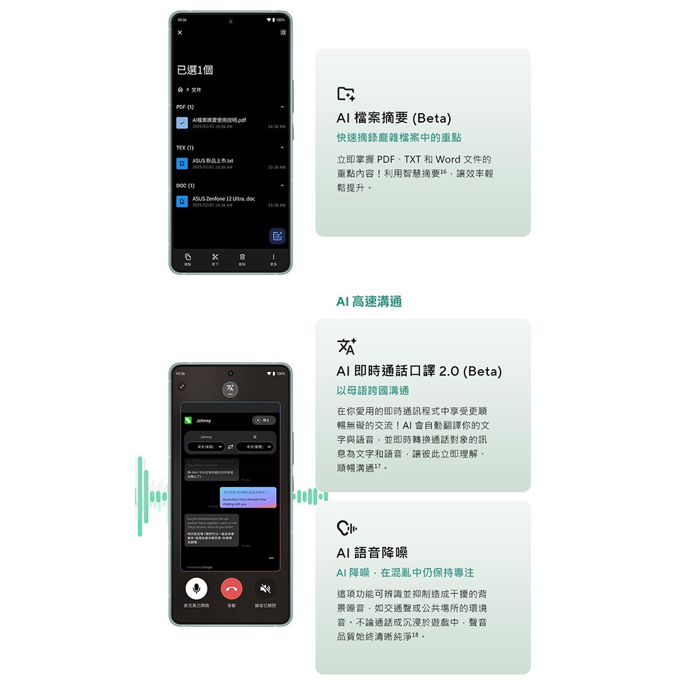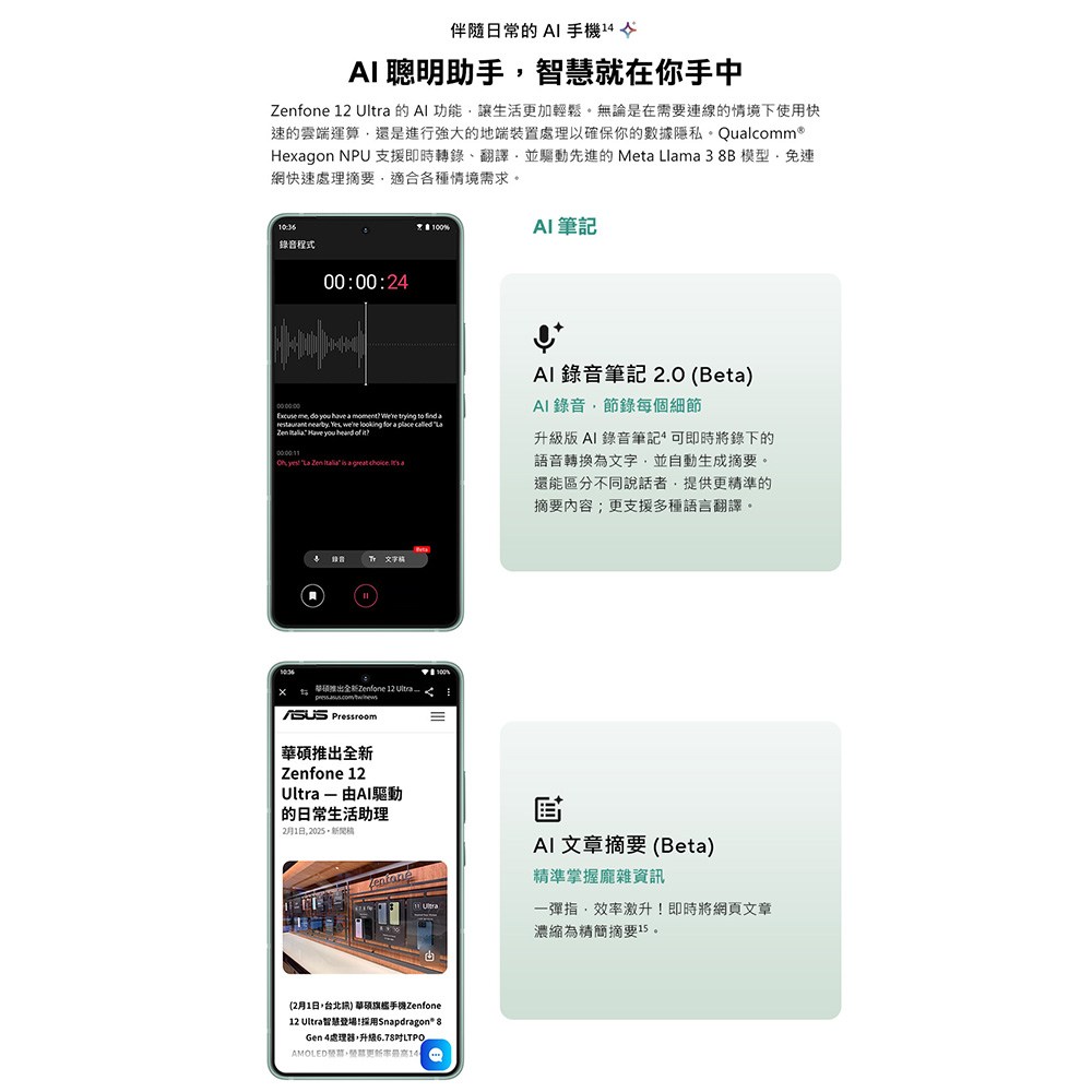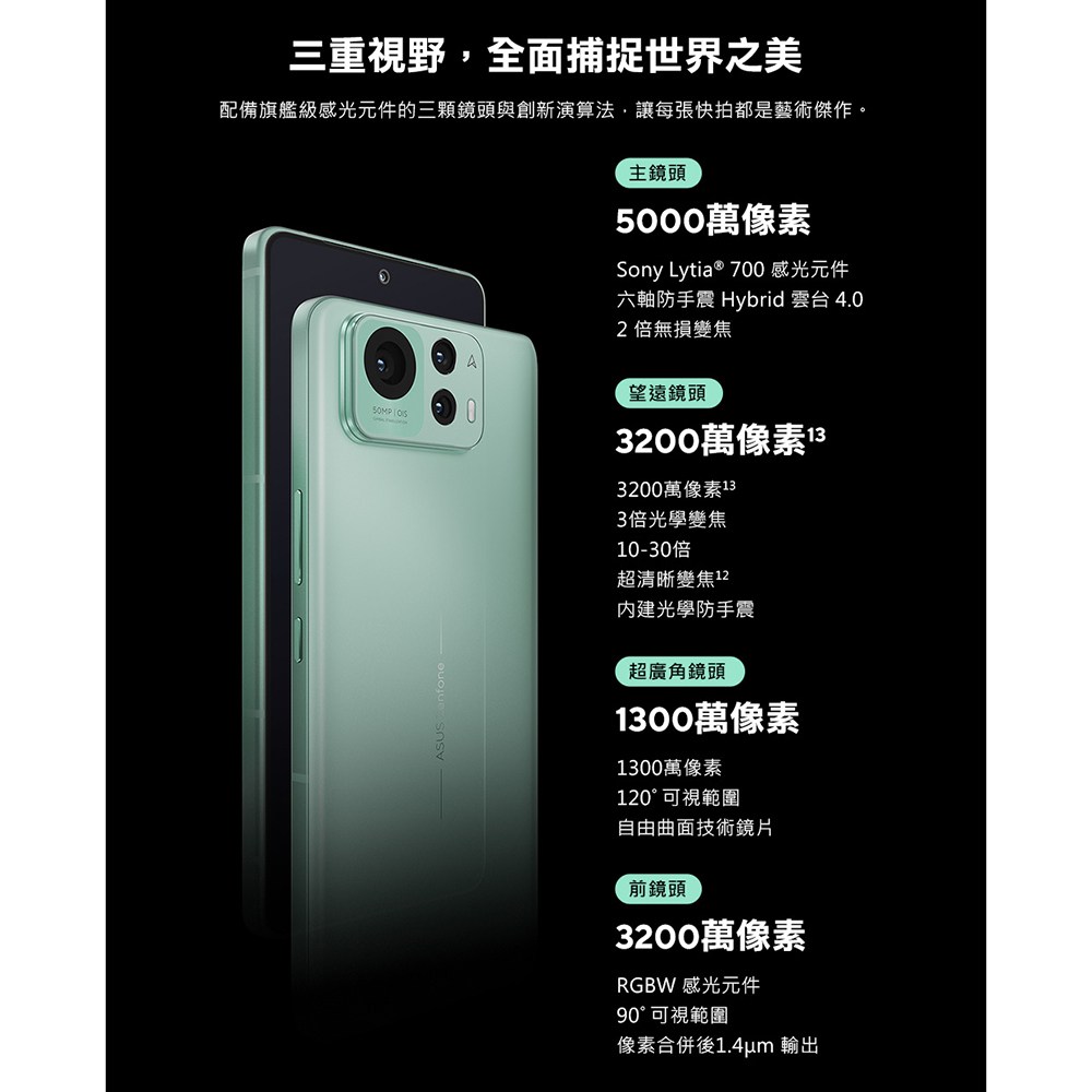 ASUS 華碩 ZenFone 12 Ultra 是一款集結頂尖科技與美學設計的智慧型手機。它配備 6.78 吋 AMOLED 螢幕,色彩鮮明,細節銳利,讓您沉浸在影音娛樂的世界中。搭載 Qualcomm Snapdragon 8 Elite 處理器,提供卓越的效能和 AI 功能,讓您輕鬆應對各種任務。此外,5000 萬像素主鏡頭與三鏡頭系統,讓您隨時捕捉生活中的精彩瞬間。5500mAh 大容量電池與 65W 超高速充電,讓您擺脫電量焦慮,享受全天候的行動體驗。冷杉綠配色更顯時尚品味。