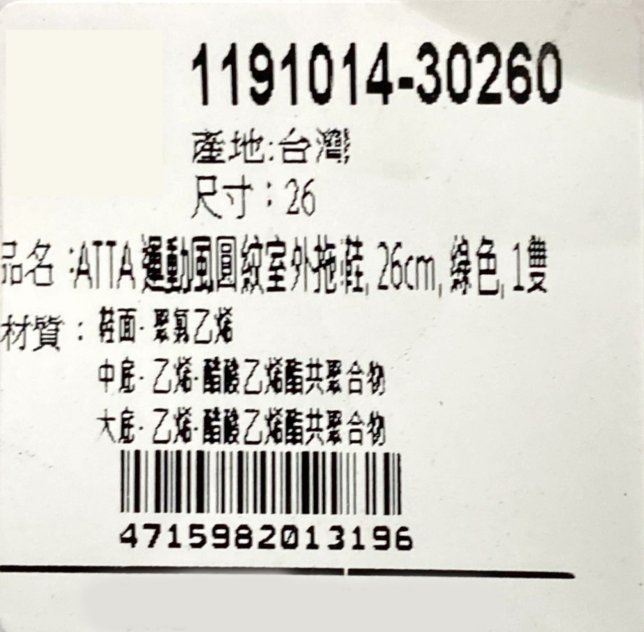 ATTA 運動風圓紋室外拖鞋,為男士提供舒適與時尚兼具的選擇。這款綠色拖鞋採用耐用的聚氯乙烯鞋面和輕盈的EVA材質,適合室外穿著。圓紋設計不僅增添了視覺吸引力,還能提供額外的抓地力。26公分的尺寸確保合適的貼合感,平底設計則保證了長時間行走的舒適性。無論是休閒外出還是居家放鬆,這款拖鞋都能滿足您的需求,讓您在享受舒適的同時,展現您的運動時尚品味。
