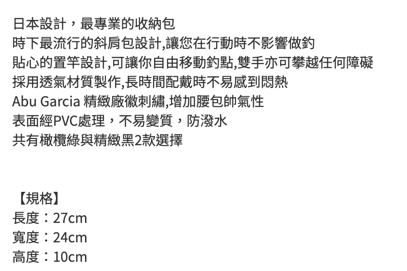 - 採用耐磨尼龍材質,堅固耐用,讓您的釣魚裝備得到妥善保護。