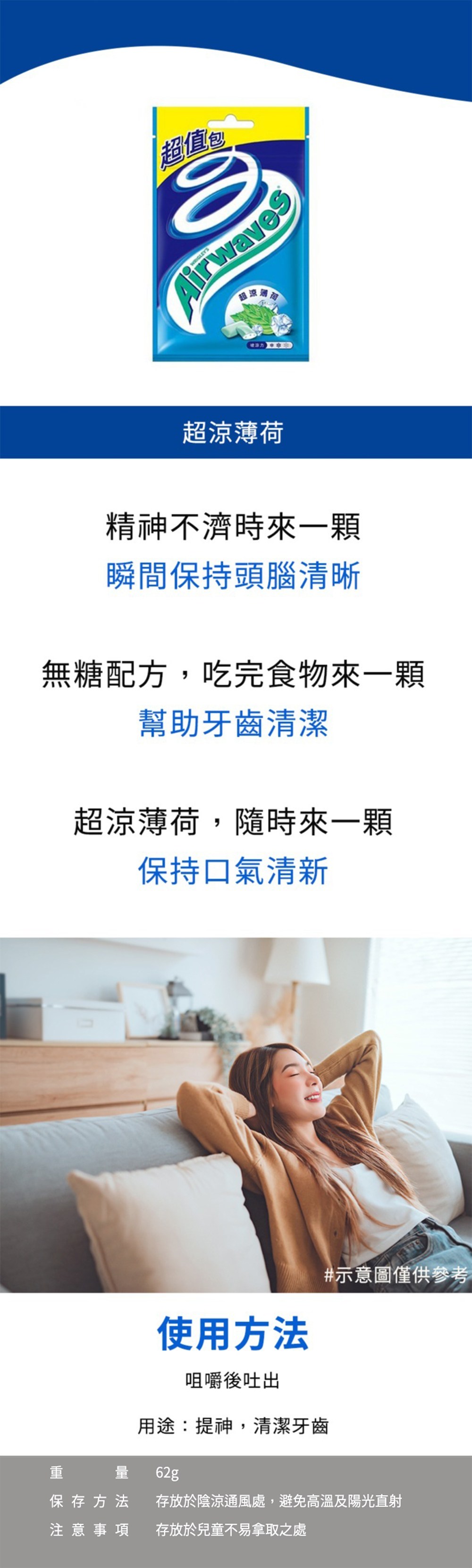 - - Airwaves超涼無糖口香糖,瞬間釋放超強薄荷,享受持久的清新暢快感受。