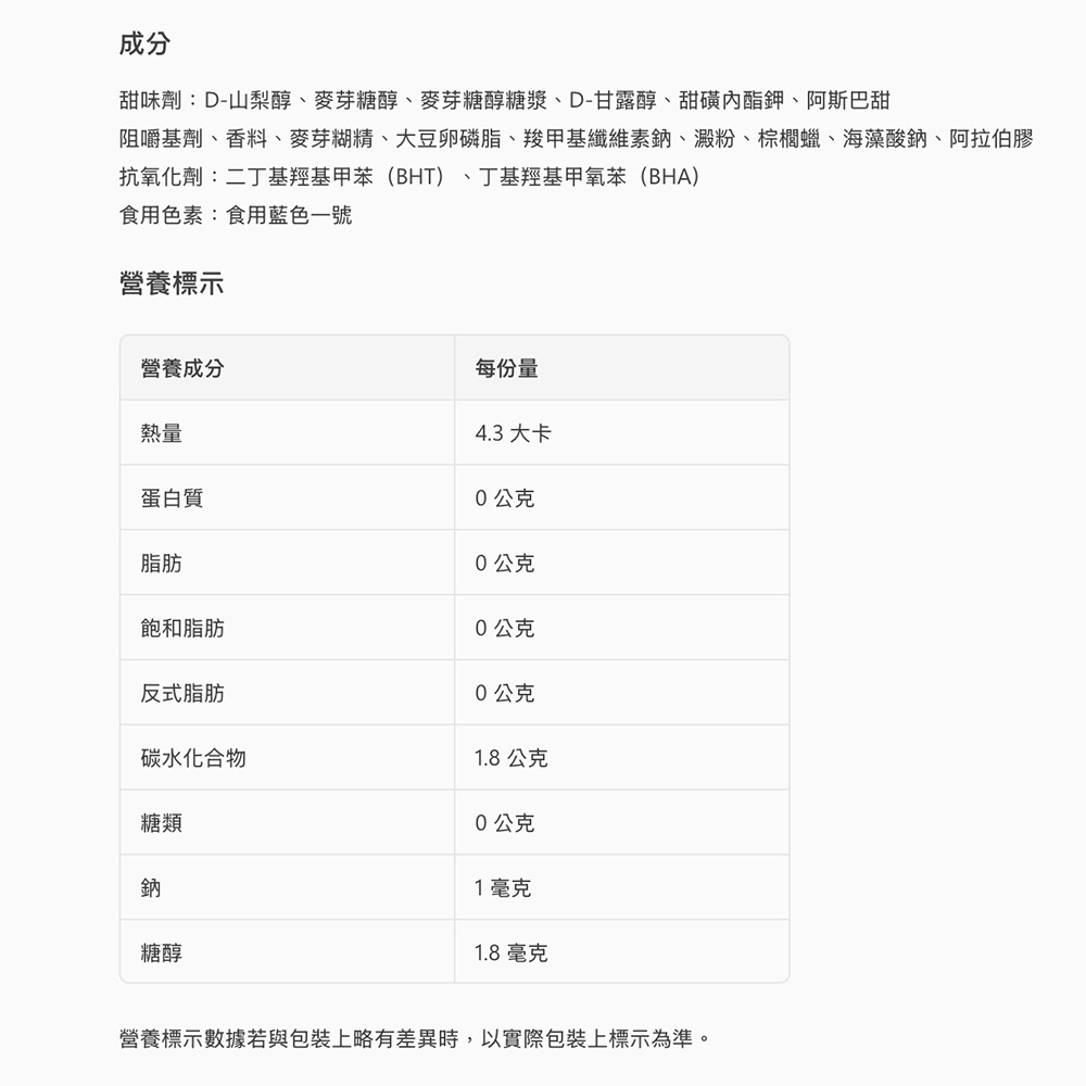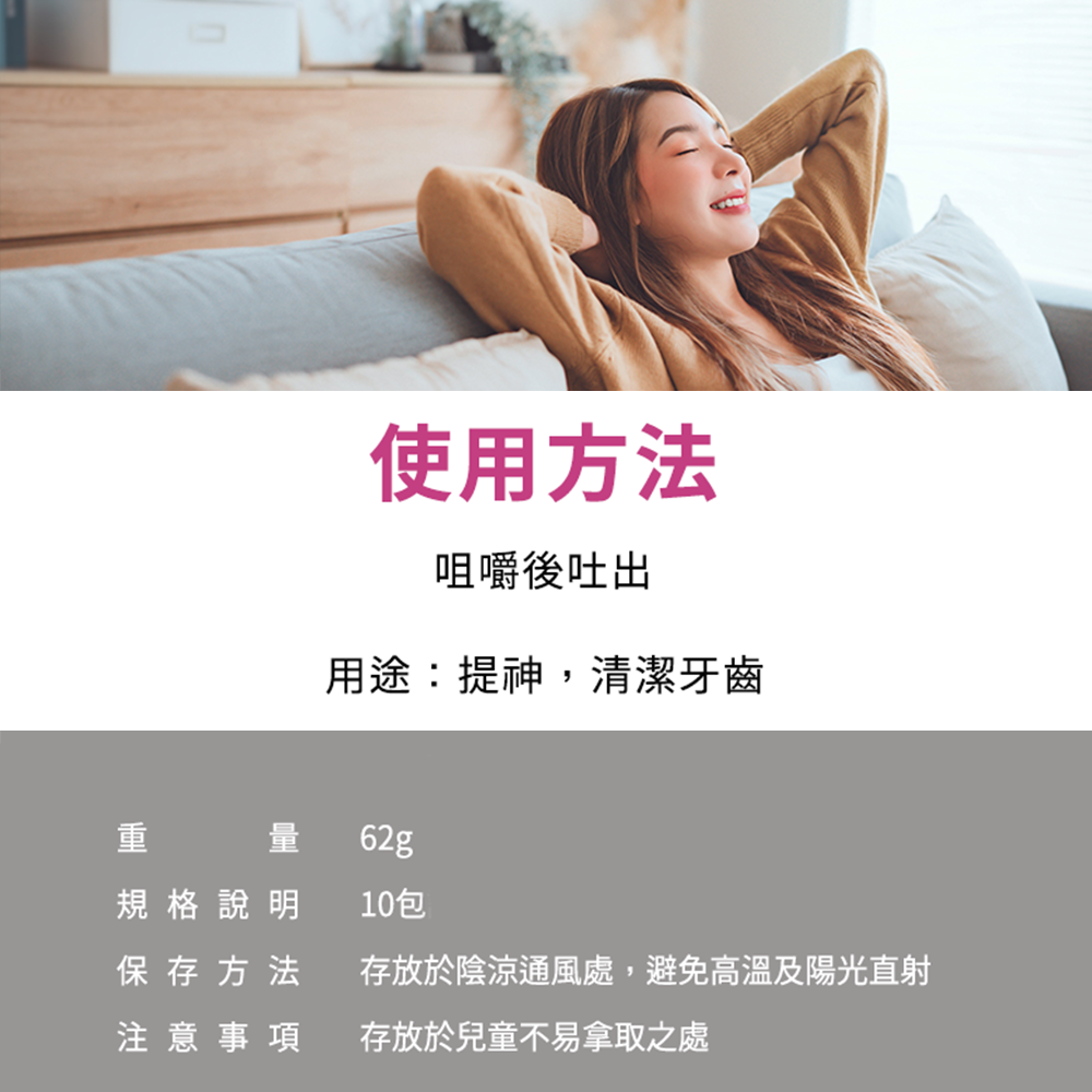 - 無糖配方讓您隨時享受美味,不必擔心糖分攝取,清新口氣,享受無負擔的清新體驗。