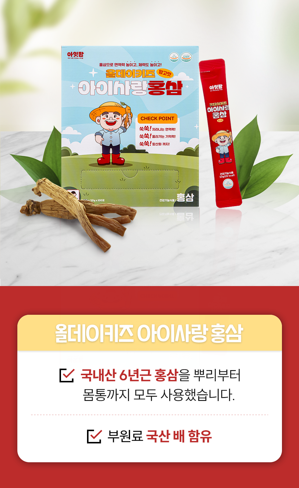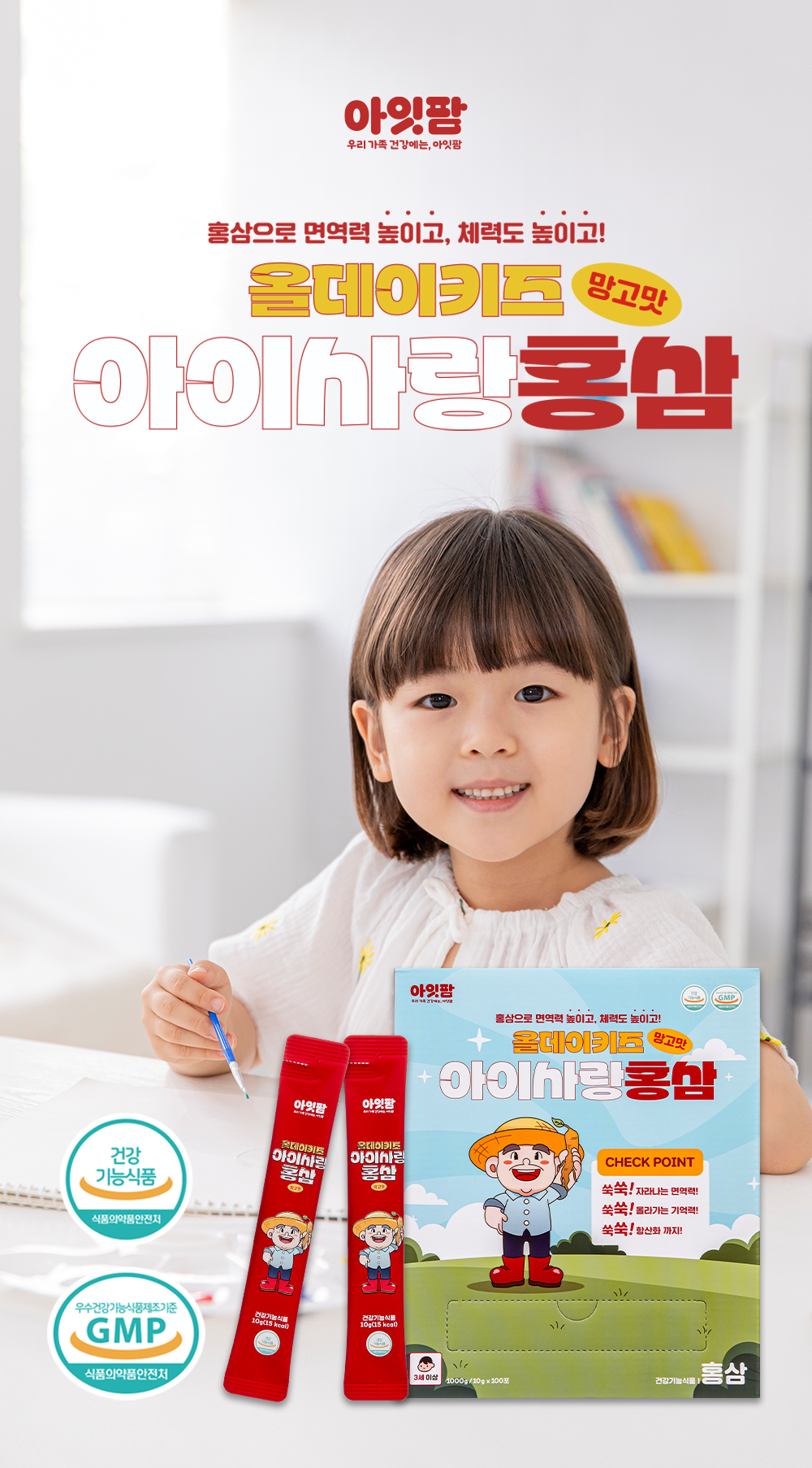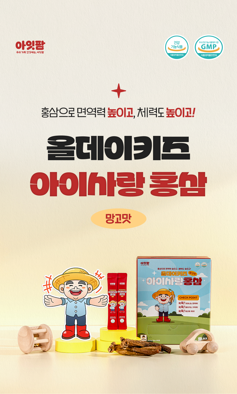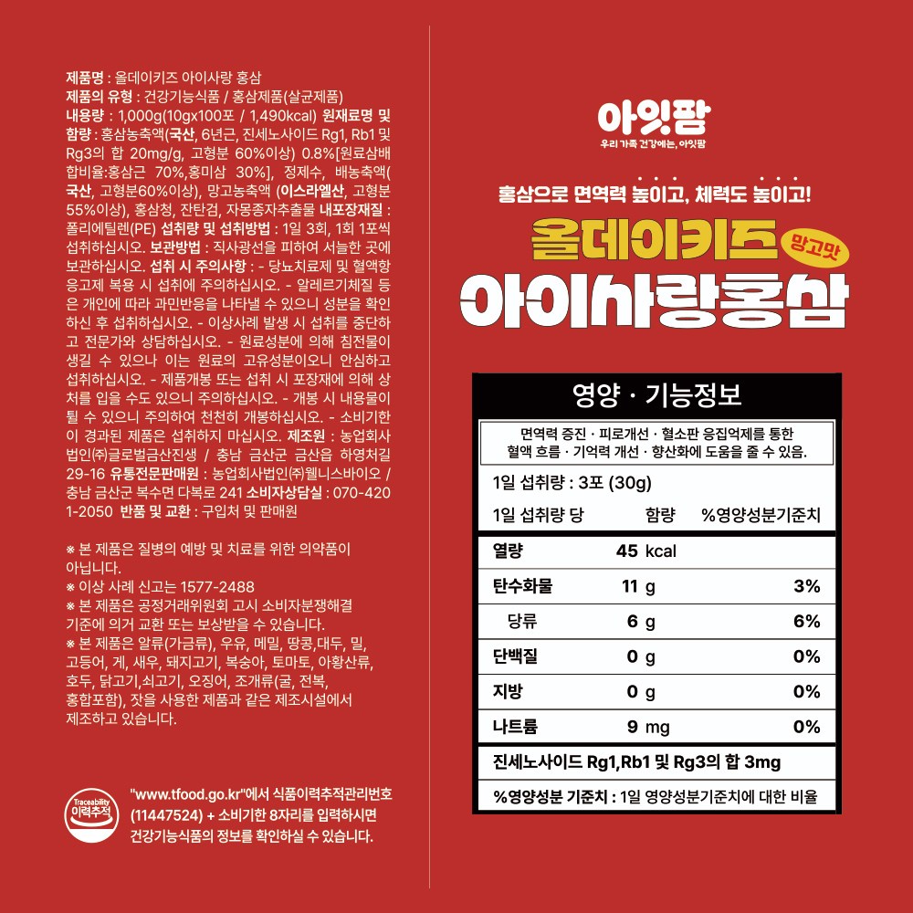 Aitfarm All Day孩童眼睛愛護紅蔘,專為3歲以上兒童設計的健康機能食品。嚴選韓國六年根紅蔘,搭配芒果風味,口感香甜,孩子們喜愛。獨立包裝,方便攜帶,隨時補充,守護孩子健康成長。本產品不含合成香料、液態果糖等添加劑,讓家長安心。