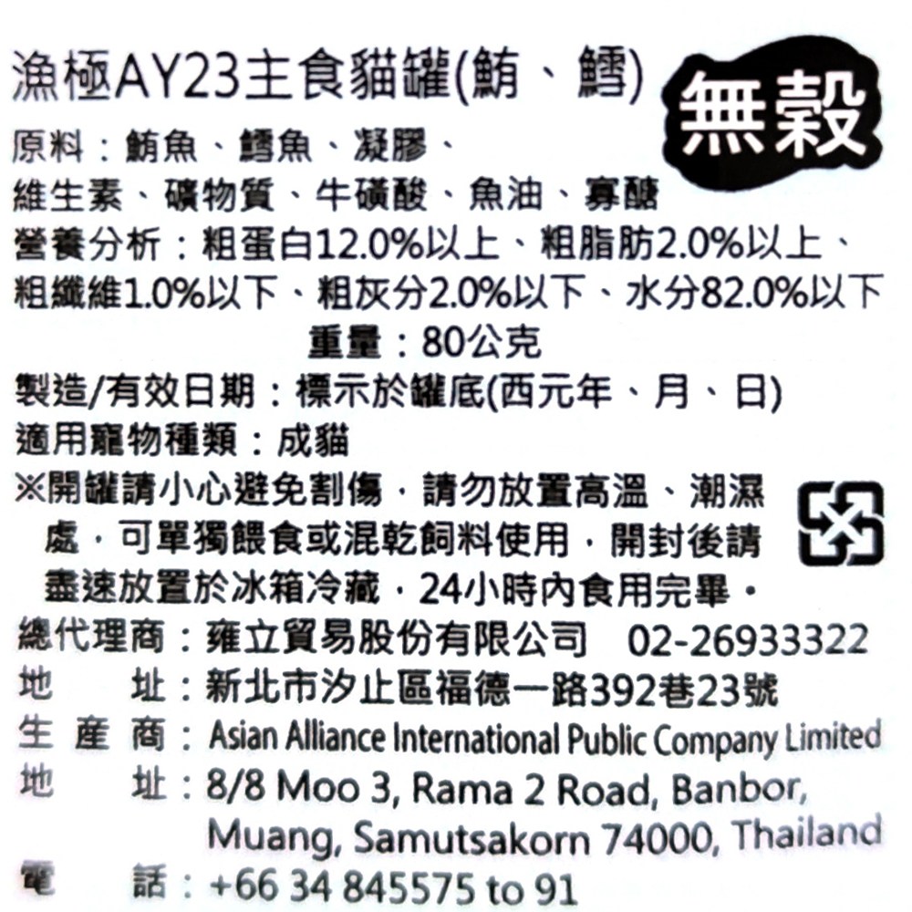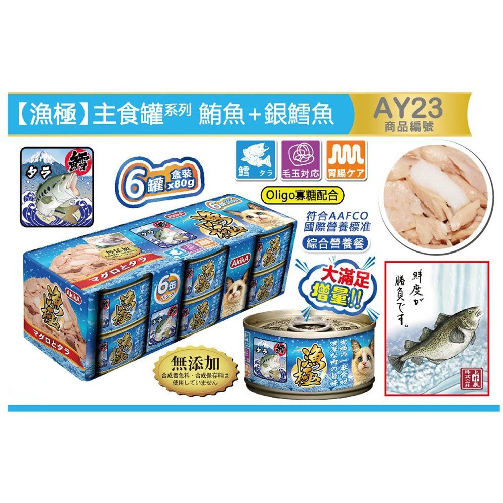 漁極AY23主食罐頭,為您的愛貓提供美味又營養的無穀選擇。這款罐頭以新鮮鮪魚和鱈魚為主要原料,富含Omega-3脂肪酸,有助於維持貓咪的毛皮健康亮麗。無穀配方,易於消化,特別適合對穀物敏感的貓咪。每罐80克,一組6罐,方便餵食和儲存。讓您的愛貓享受來自海洋的美味,同時獲得全面的營養呵護。