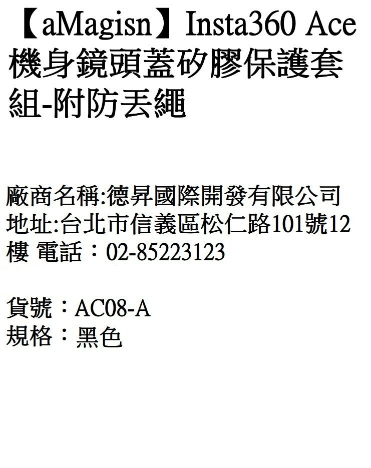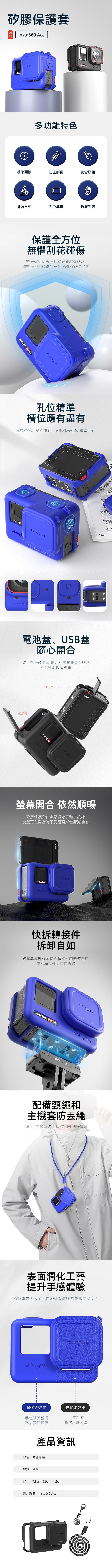 aMagisn Insta360 Ace 機身鏡頭蓋矽膠保護套組,為您的運動相機提供全方位的保護,還能吸收輕微碰撞帶來的衝擊,讓您在各種戶外活動中都能安心使用。隨附的防丟繩設計,讓您無需擔心相機遺失,方便攜帶且安全可靠。精準的開孔設計確保所有功能按鈕和接口都能輕鬆使用,不影響相機的操作體驗。無論是日常拍攝還是極限運動,這款保護套都是您Insta360 Ace的最佳夥伴,讓您盡情享受攝影的樂趣。