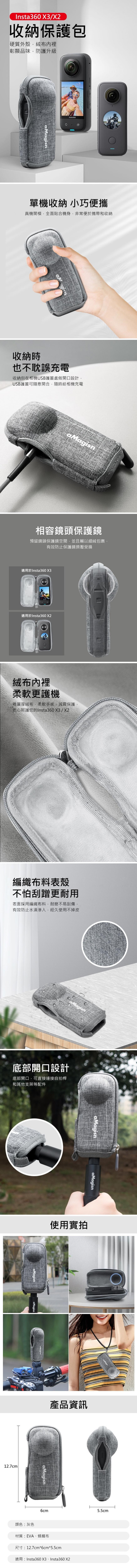 這款aMagisn Insta360 X3/X2收納保護包,是專為您的Insta360相機量身打造的完美配件。灰色簡約設計,不僅時尚有型,更能提供全方位的保護。採用耐磨編織布料,讓您的相機免受日常磨損。柔軟的絨布內裡,給予相機溫柔呵護。底部開口設計,方便連接自拍桿或其他支架配件,隨時隨地輕鬆拍攝。此外,貼心的USB護蓋開口設計,讓您無需取出相機,即可隨時充電,確保您的創作靈感不間斷。