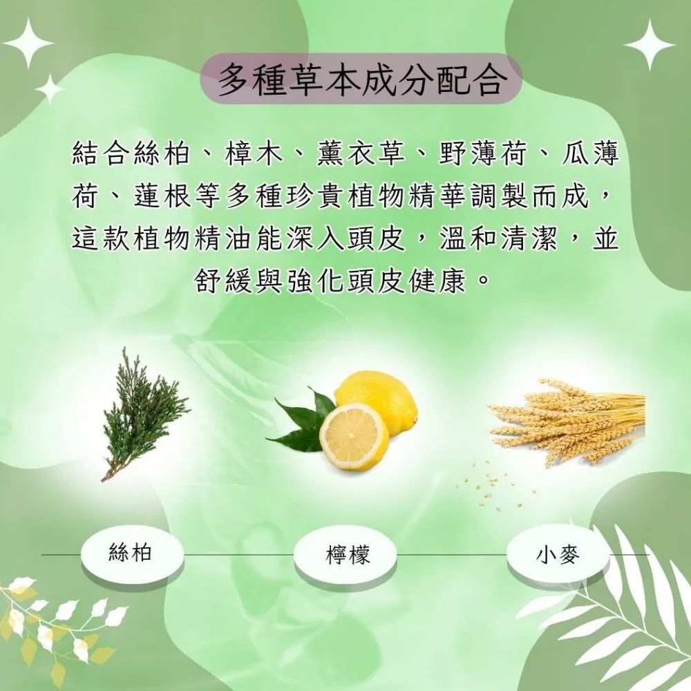 - 絲柏精華深層滋養,洗後頭皮清爽舒適,髮絲柔順易梳理不打結。