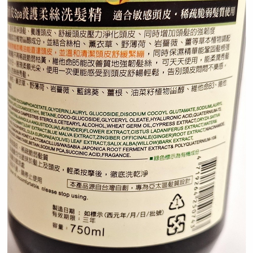 艾瑪花園絲柏頭皮SPA養護柔絲洗髮精,專為呵護敏感頭皮和脆弱髮質而設計。這款洗髮精結合絲柏精華與植物胺基酸,溫和潔淨頭皮的同時,舒緩頭皮壓力,告別頭皮屑困擾。配方中的小麥蛋白和維他命B5能深入滋養髮根,強化髮絲韌性,使秀髮恢復健康強韌,展現柔順光澤。750ml大容量,讓您在家也能享受SPA級的頭皮護理。