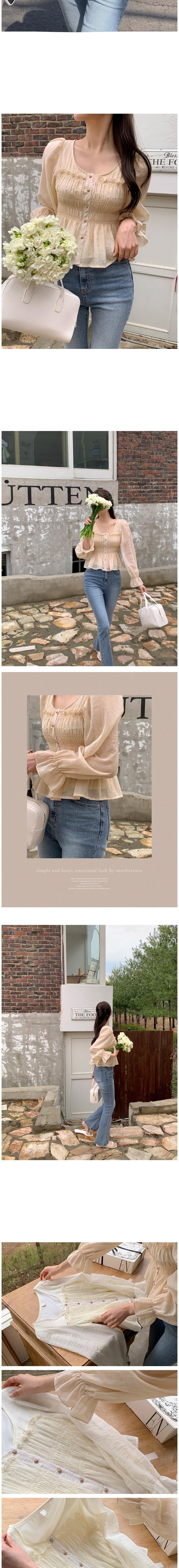 Another TWEE女款Coco Ring抽繩鈕扣襯衫,採用輕薄透視的聚酯纖維材質,觸感舒適,適合四季穿著。象牙白色調散發女性魅力,搭配精緻的抽繩鈕扣設計,增添了服裝的設計感。U領設計展現鎖骨線條,荷葉邊袖口遮蓋手臂贅肉,讓您在舉手投足間散發優雅氣質。無論是搭配牛仔褲或裙子,都能輕鬆打造出時尚造型,展現您的個人魅力。