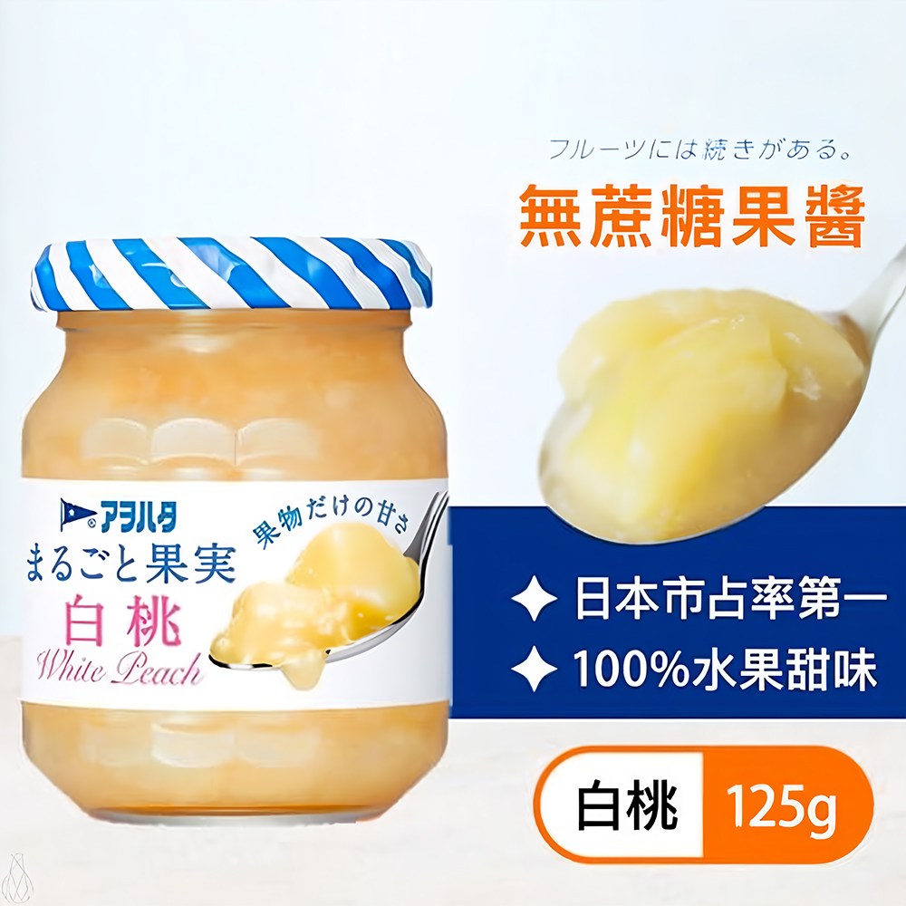 Aohata 白桃果醬,日本原裝進口,嚴選日本白桃。無添加蔗糖,口感清爽,甜度適中,適合注重健康的您。125g小容量玻璃罐裝,方便攜帶與保存。無論是搭配吐司、優格或鬆餅,都能為您帶來美味又健康的享受。純素可食,低糖配方,讓您安心品嚐水果的甜蜜滋味。