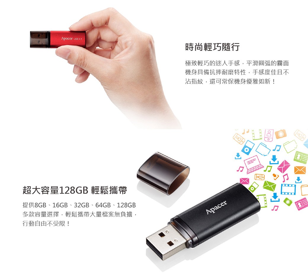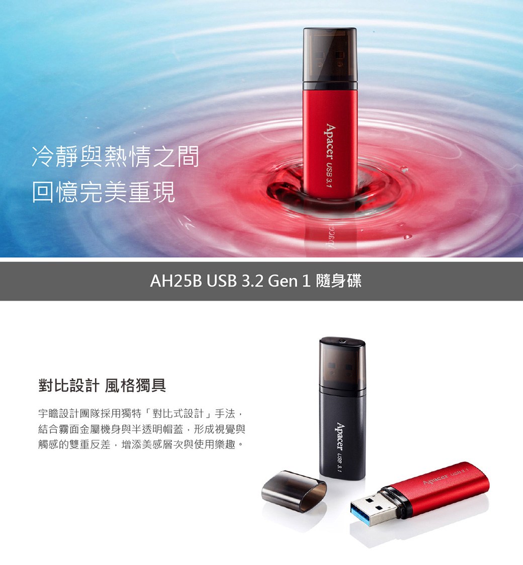 Apacer AH25B USB 3.2 Gen 1 隨身碟,紅色外觀時尚亮眼,64GB大容量輕鬆儲存文件、照片、影片等資料。採用USB 3.2 Gen 1高速傳輸介面,傳輸速度更快,節省您的寶貴時間。筆蓋式設計,保護USB接頭。輕巧便攜,方便您隨時隨地儲存和分享資料。Apacer品牌值得信賴,品質保證,讓您安心使用。