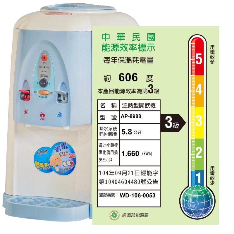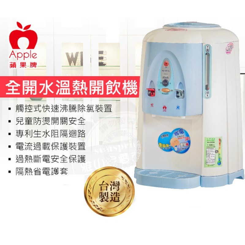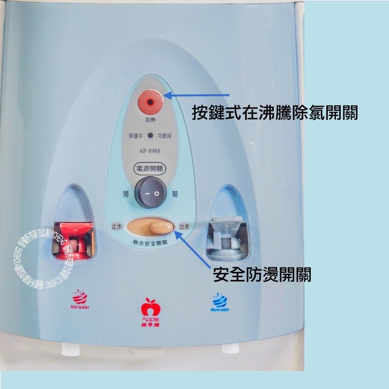 全開水溫熱開飲機 AP-8988,為您的生活帶來便利與健康。這款飲水機採用304不鏽鋼內膽,安全衛生,讓您安心飲用。具備快速沸騰除氯功能,確保水質純淨,同時設有兒童防燙安全開關,保護家人的安全。擁有5.8公升熱水及2公升溫水容量,滿足全家人的飲水需求。此外,本產品為台灣製造,品質有保障,並提供一年保固,讓您買得放心,用得安心。