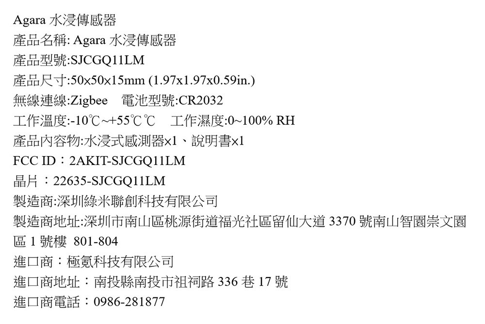 - 包裝內容物/內含組件: 水浸式感測器x1、說明書x1