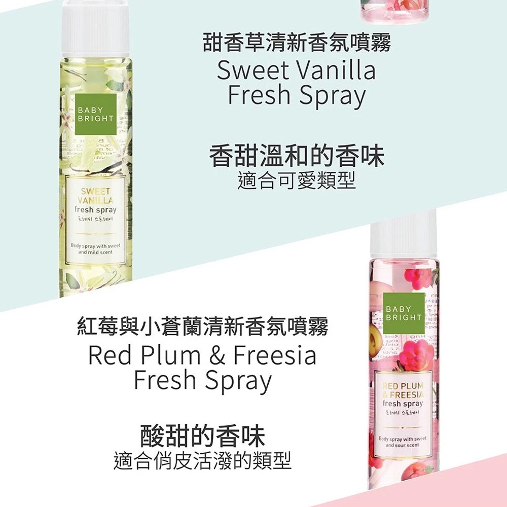 Baby Bright 紅莓與小蒼蘭清新香氛噴霧,是一款能隨時隨地帶來清新感受的香氛產品。其獨特的紅莓與小蒼蘭香調,酸甜清新,適合追求活潑氣息的您。小巧輕便的設計,方便攜帶,讓您隨時散發迷人香氣。輕輕一噴,即可去除異味,讓空氣清新宜人,心情也更加舒暢。三入裝更划算,讓您持久散發個人魅力,展現獨特品味。